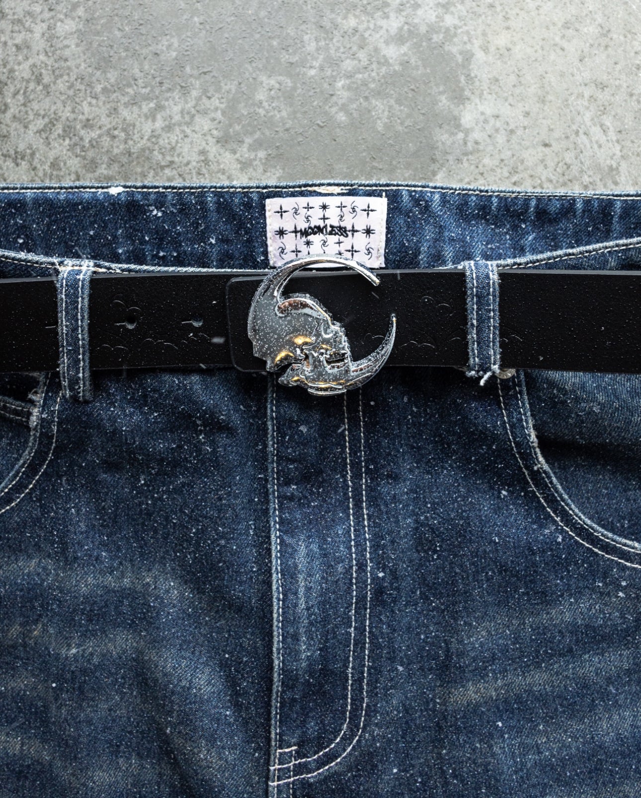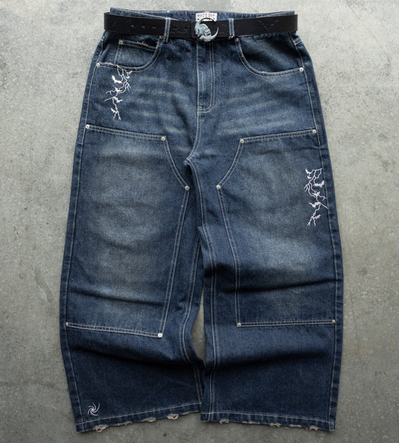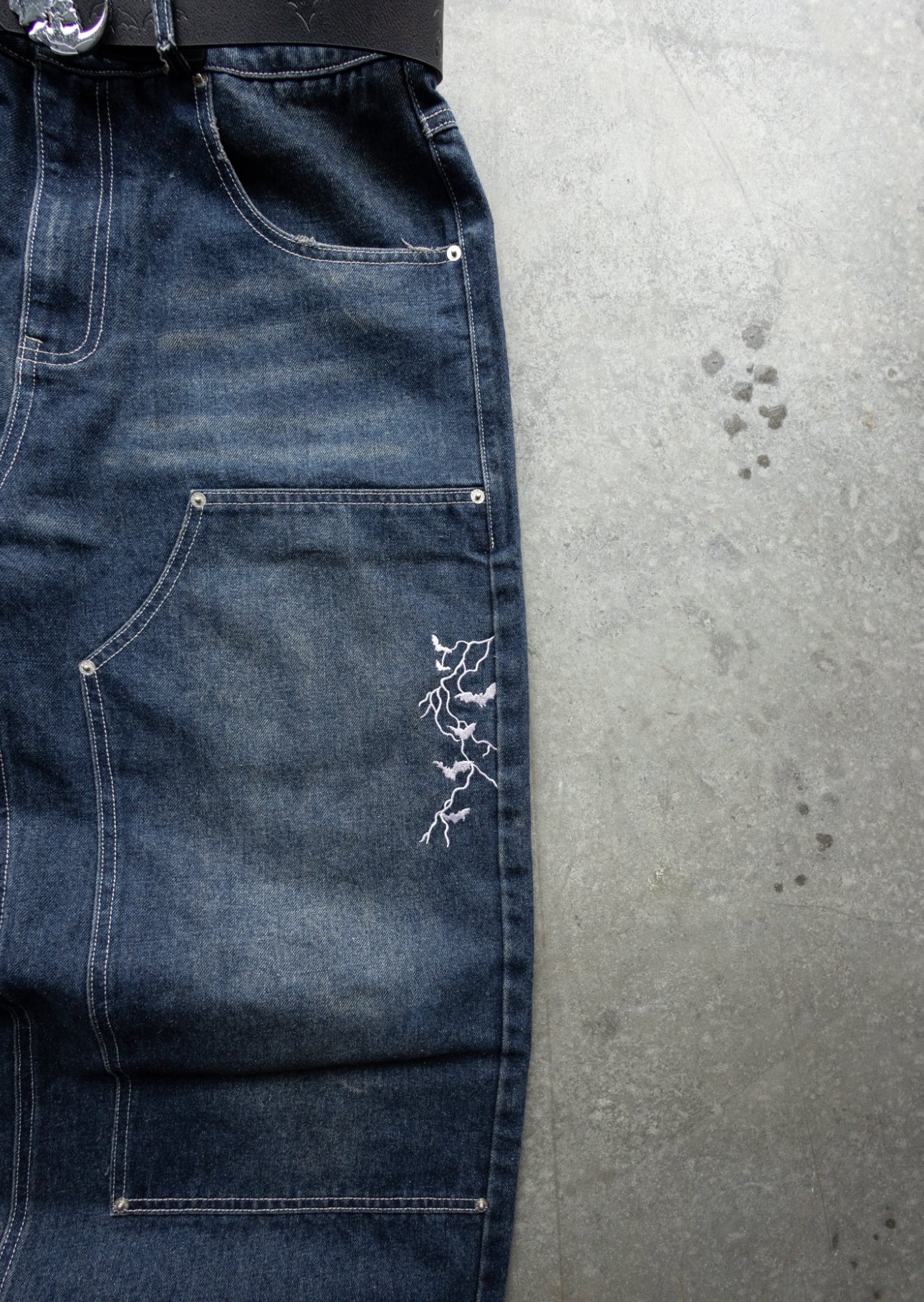-Navy Sand Wash denim with white sticthes and embroidery
