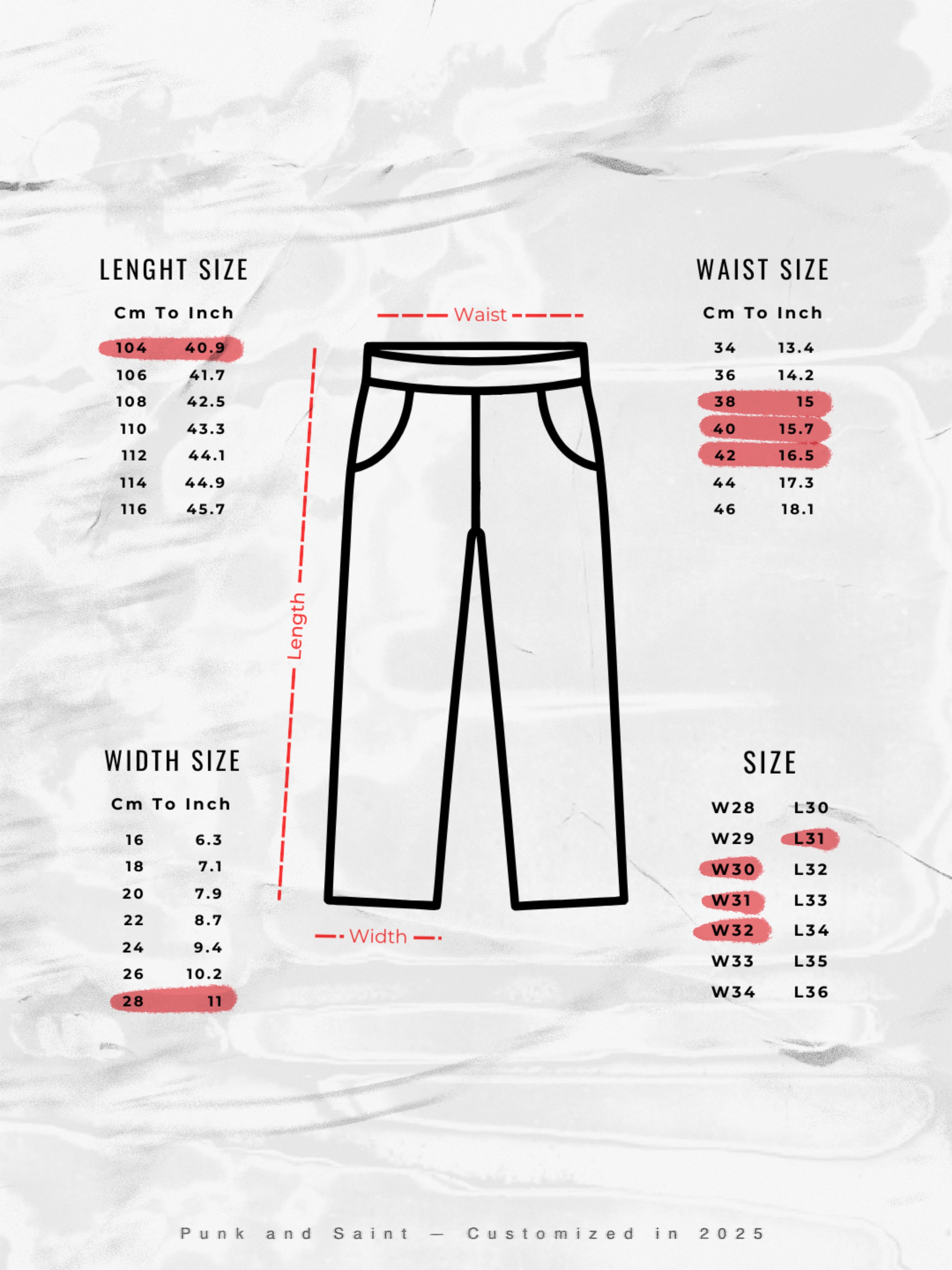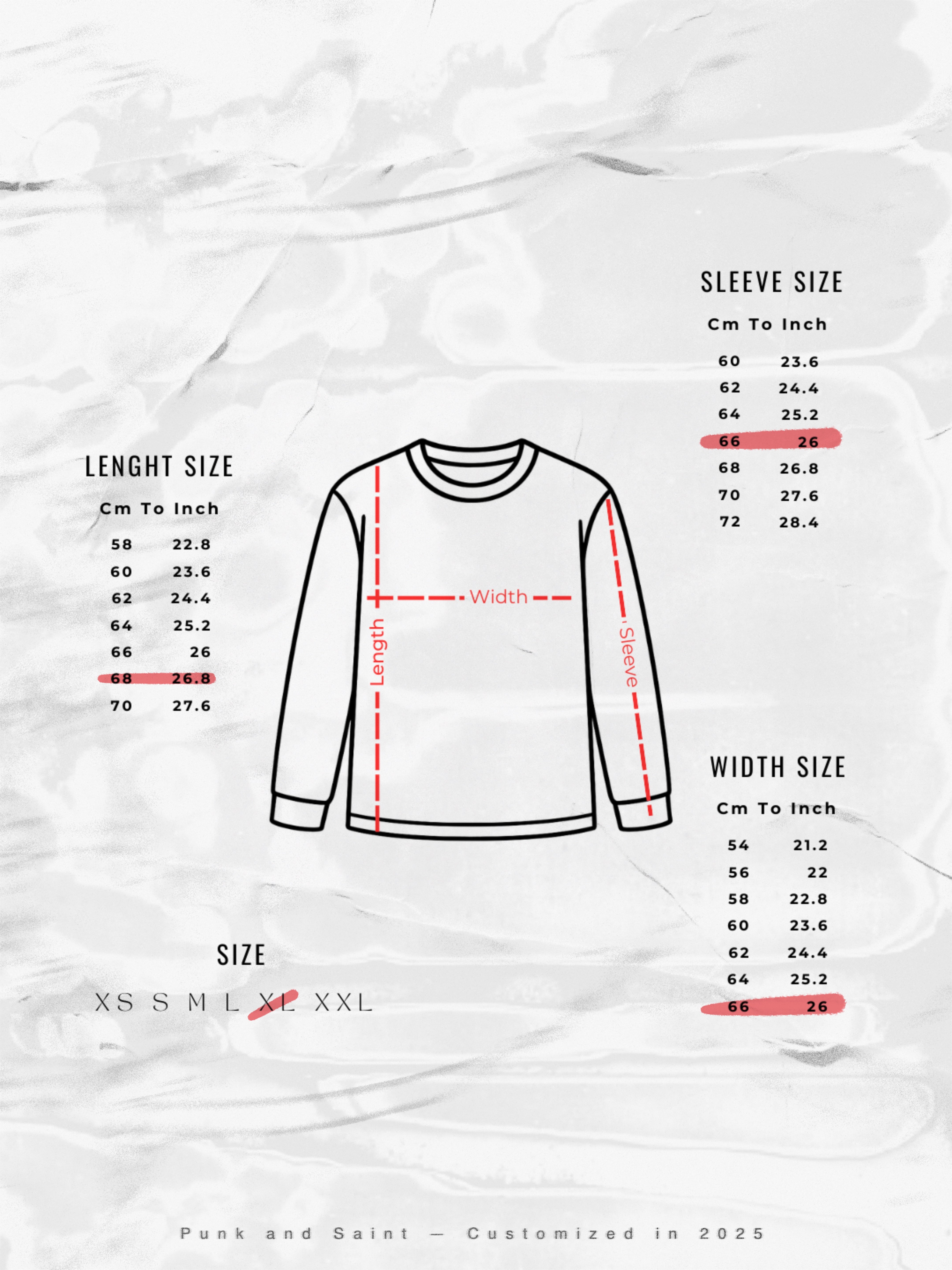 Size chart is included in the final photo. Please compare the measurements with your own pieces to find the best fit. Every order ships with care instructions and a couple of Punk And Saint stickers as a gift from us.