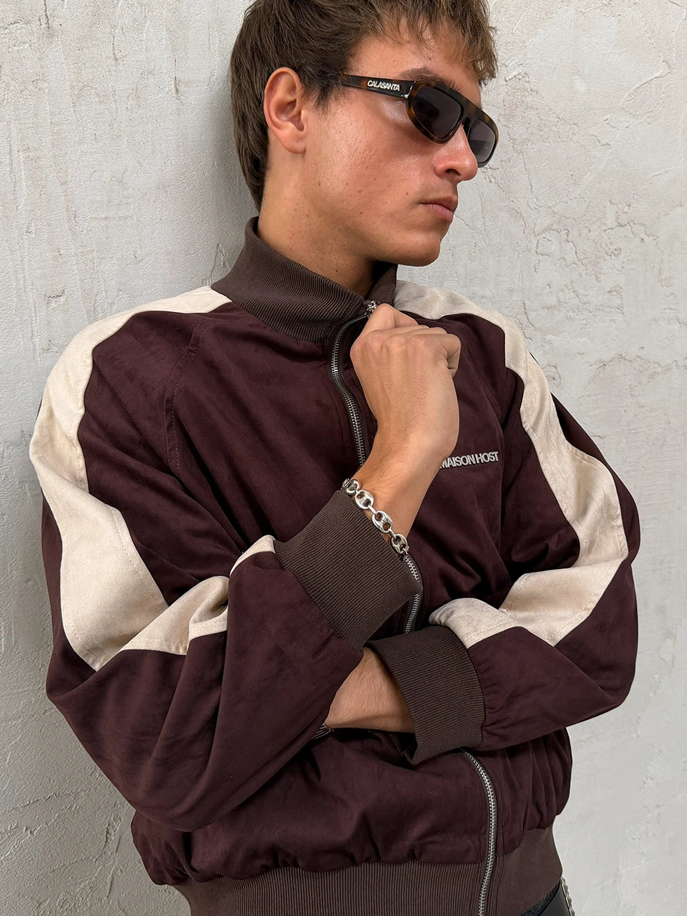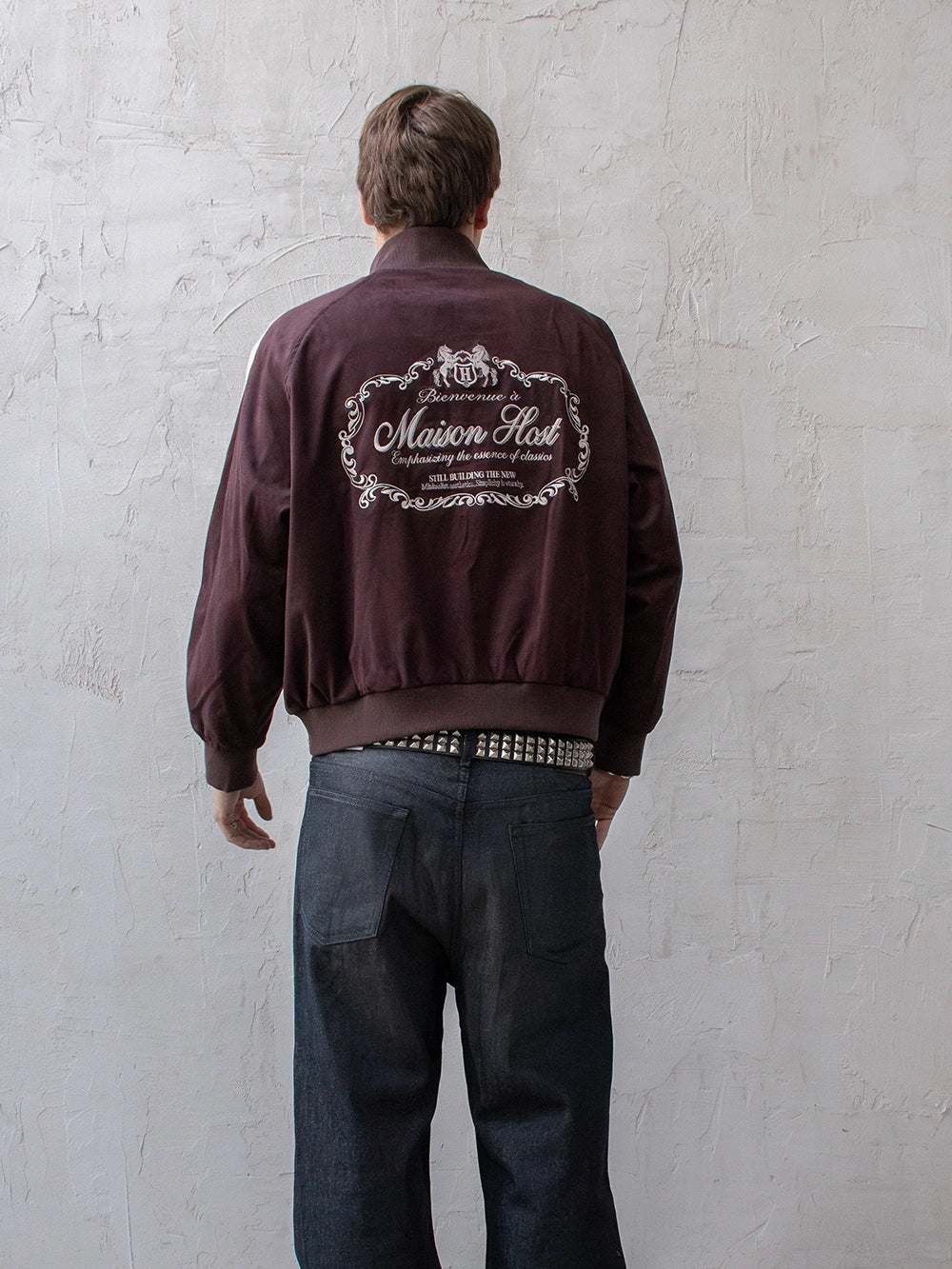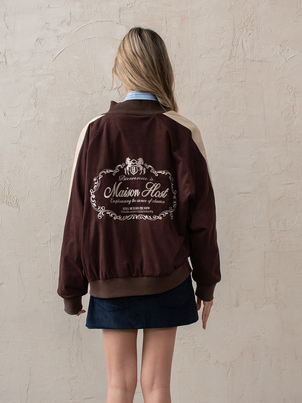 Features two-tone sleeves, a double metal zipper with engraved H shields, and a metal MAISON HOST logo on the left chest.
