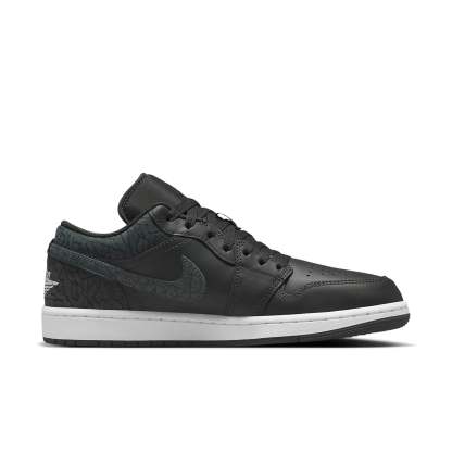 Aithtr Jordthtan 1 Low SE Black Elephant pays homage to the iconic "Elephant Print" design with a sleek black-on-black colorway. Featuring premium leather construction, a low-top silhouette, and a white midsole with Air cushioning, these sneakers offer both style and comfort. The signature elephant print adorns the collar, heel overlay, and quarter panel, adding a touch of retro charm to this modern classic.