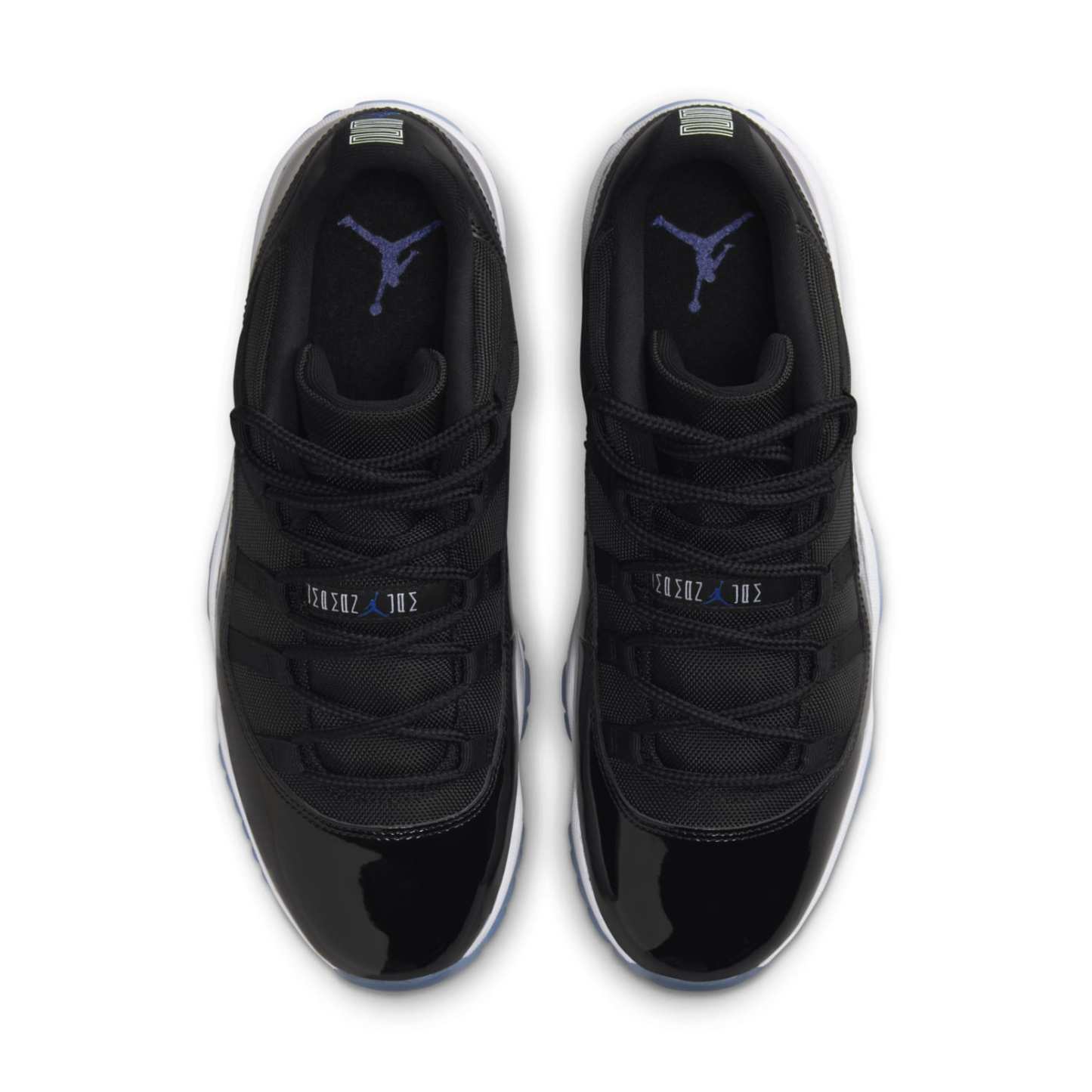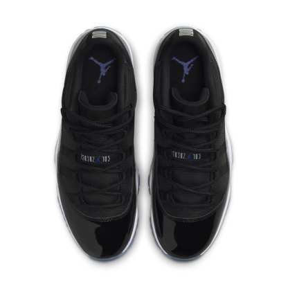 The Air Jordan 11 Low 'Space Jam' draws inspiration from the iconic high-top AJ11 of the same name. This sneaker features a black ballistic mesh upper complemented by a tonal patent leather mudguard. Rope laces thread through webbing eyelets, ensuring a secure fit. The back heel showcases a stylized ‘23’ and classic Jumpman branding. Anchoring the shoe is a white Phylon midsole equipped with full-length Air-sole cushioning and an exposed carbon fiber plate. The translucent rubber outsole boasts herringbone traction pods for superior grip.