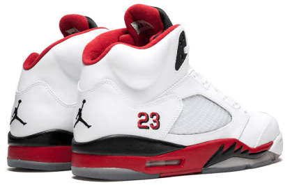 The Nike Air Jordan 5 Retro 'Fire Red' Black Tongue is a classic sneaker with a modern twist. Featuring a white leather upper, black tongue, and Fire Red accents, this sneaker is perfect for any casual or dressy outfit. The embroidered number '23' at the ankle adds a touch of class, while the red midsole, black shark teeth, and translucent outsole complete the look. Released in August 2013, the 'Fire Red' Black Tongue is a must-have for any sneakerhead's collection.