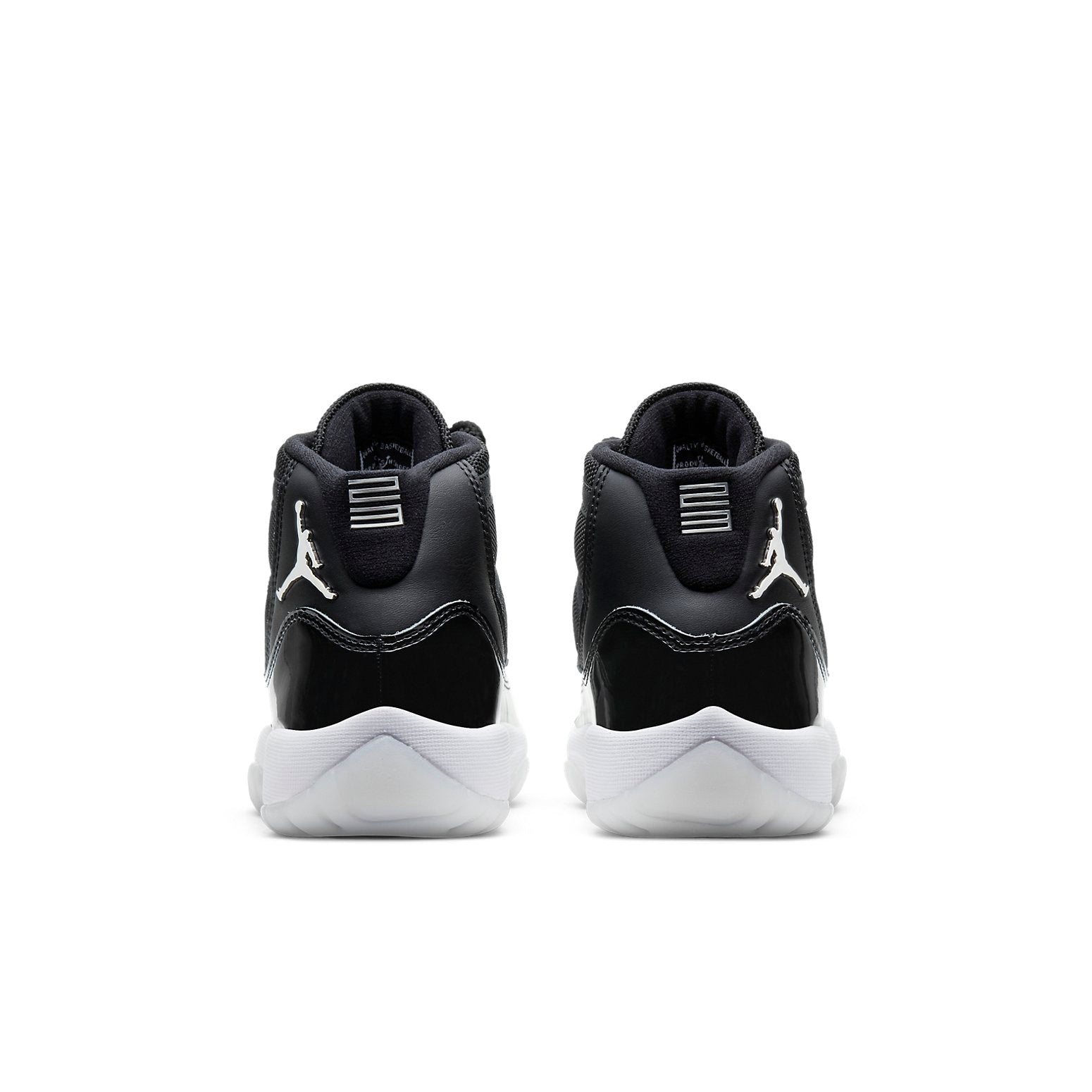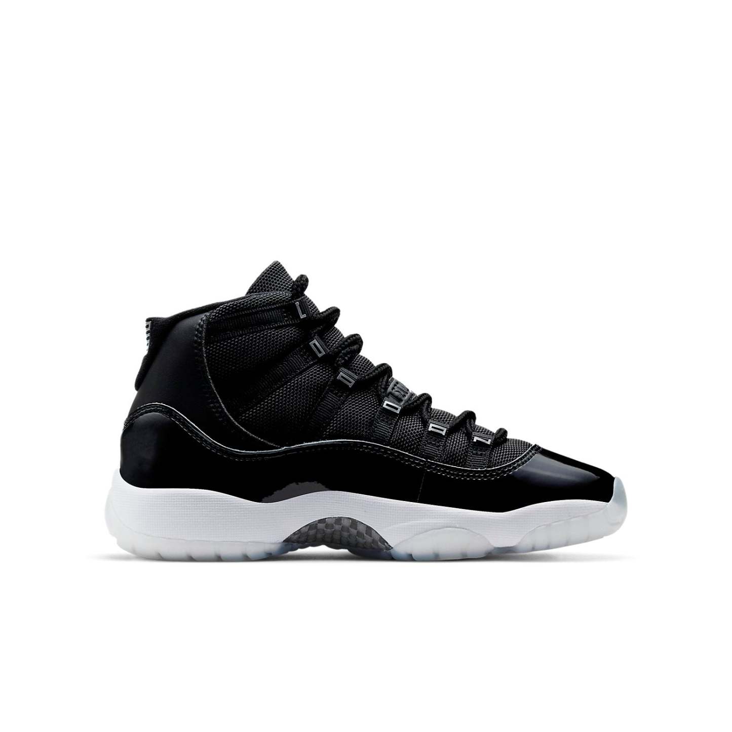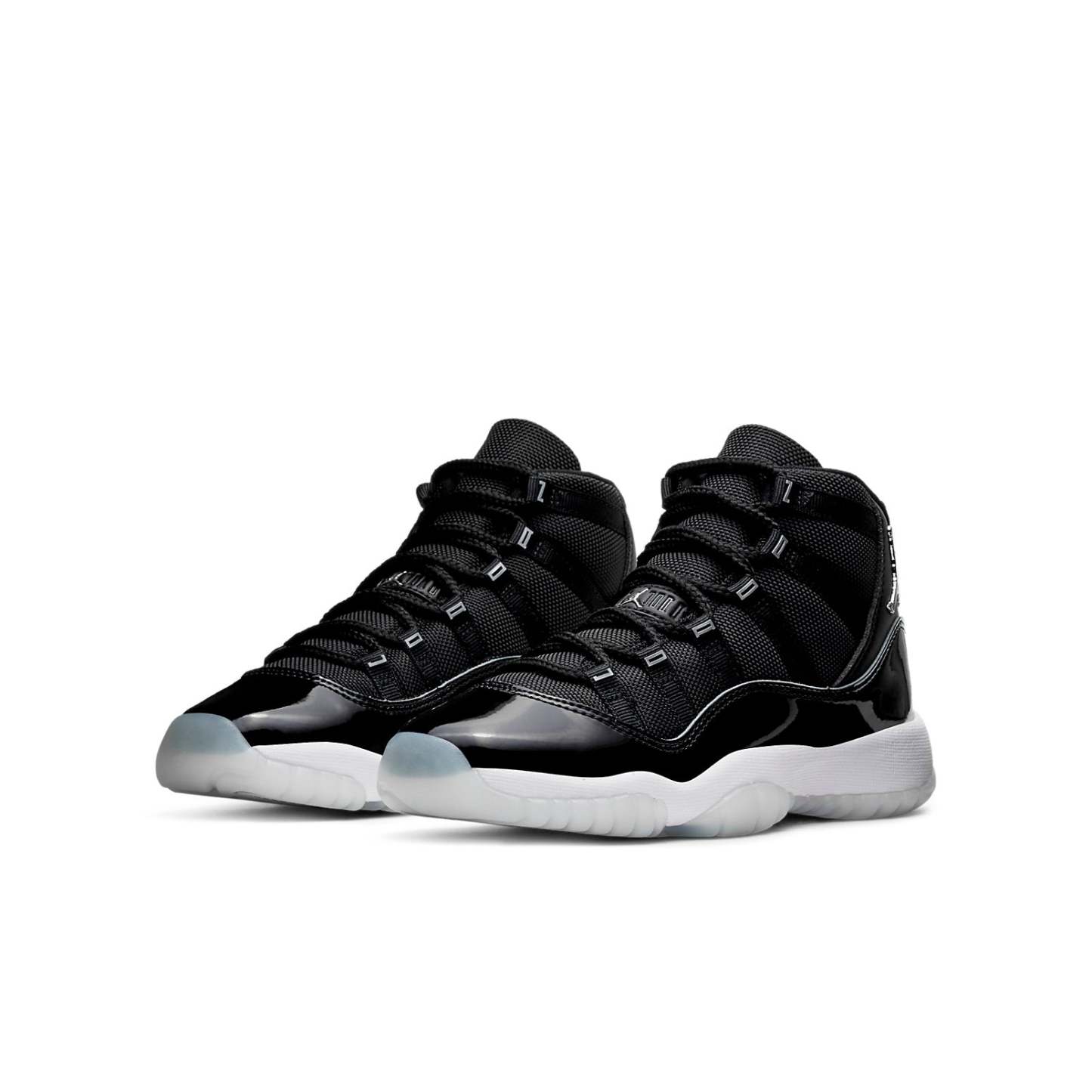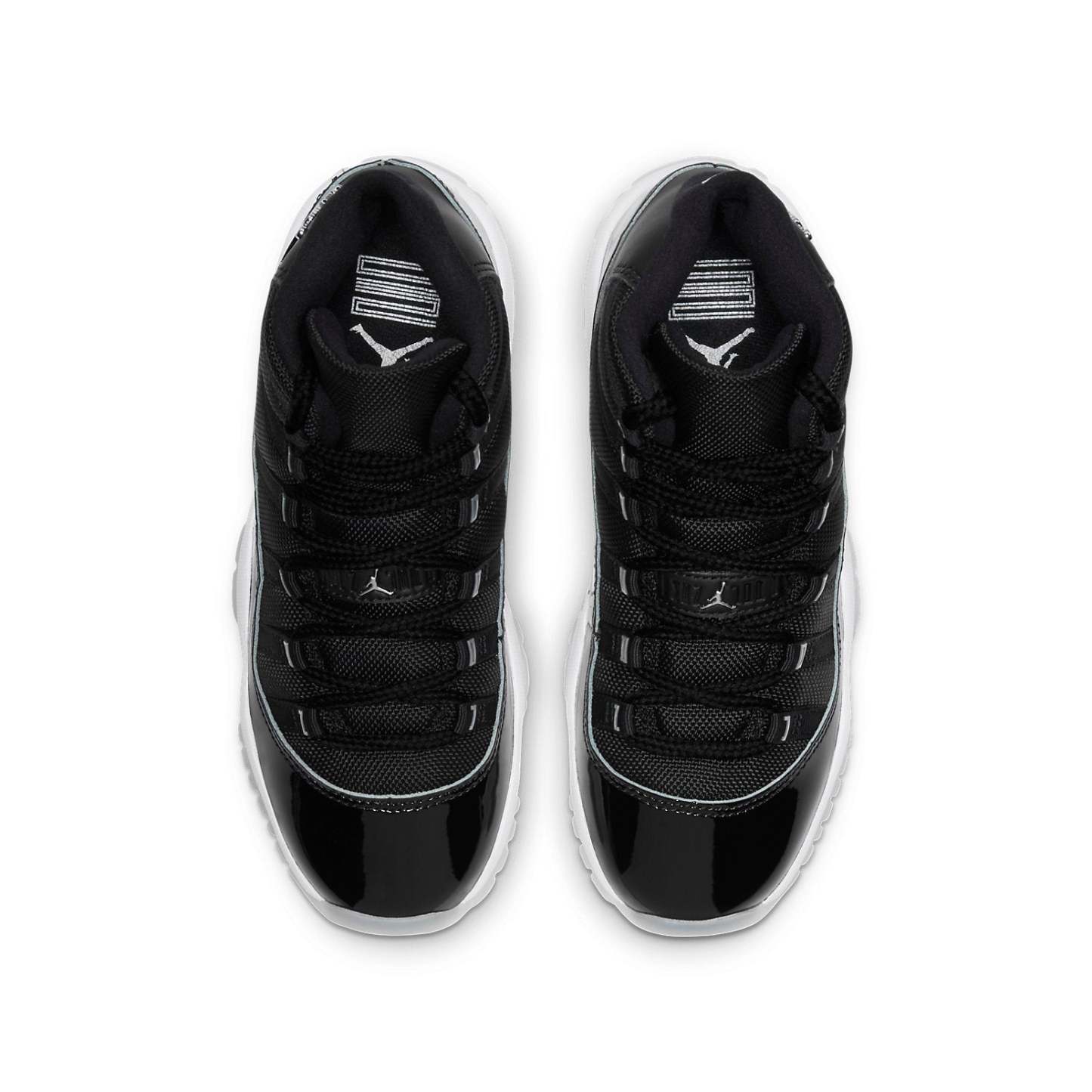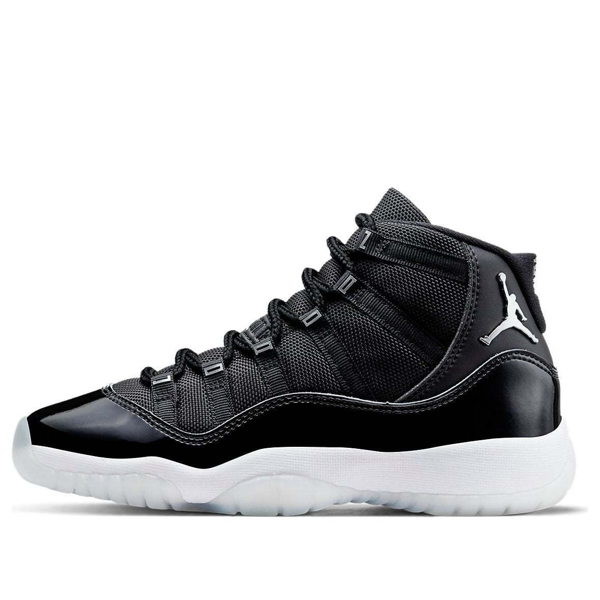 The Air Jordan 11 Retro GS is a grade school variant of the iconic Air Jordan 11 'Jubilee'. To celebrate the 25th anniversary of this classic silhouette, the shoe features a monochrome black finish throughout the upper, constructed from ballistic mesh and patent leather. 3D metallic Jumpman and matching '23' branding decorate the heel, while 'Jordan' is spelled out in Silver lettering on each of the sneaker's eyelets. The mid-top rides on a classic white foam midsole, supported by a translucent rubber outsole. This shoe is sure to be a hit with sneakerheads and Jordan fans alike - so don't miss your chance to cop!