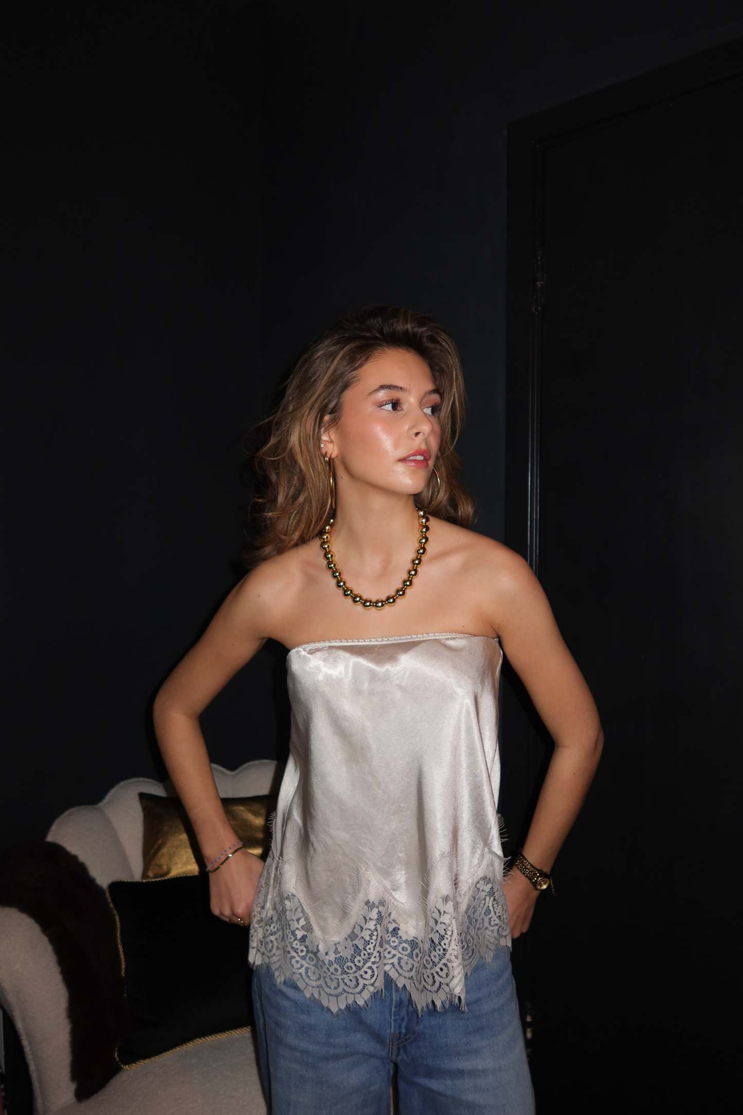 The Yuna Top features a refined, feminine look with a soft, luminous finish. Crafted from a silky, lightweight fabric, it drapes fluidly over the body for an effortless silhouette. The strapless neckline highlights the shoulders, while the delicate lace hem adds a romantic, elevated touch. Perfect to style with denim for a modern contrast or paired with tailored pieces for an elegant evening look.