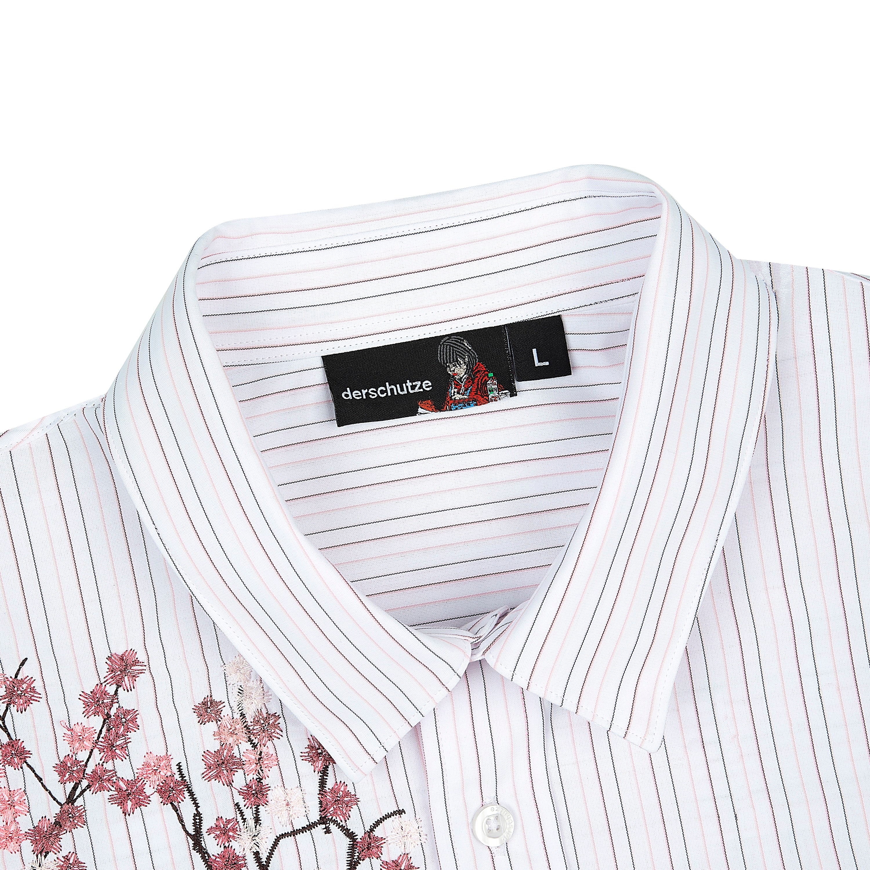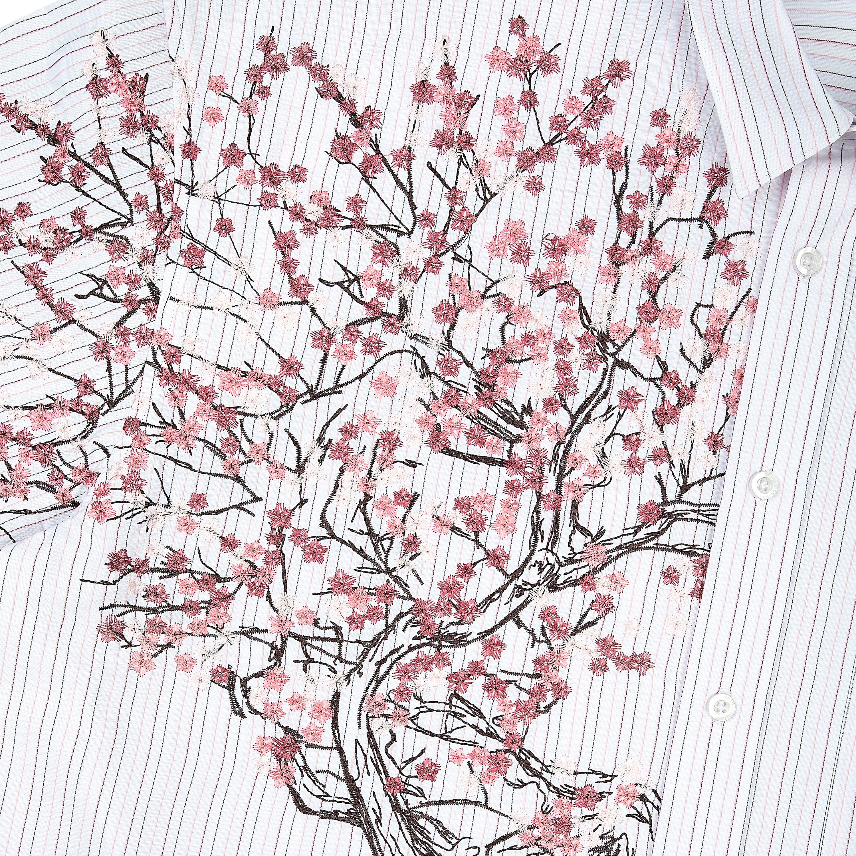poplin fabric / 55% cotton 45% polyester / striped / embroidery on front / custom buttons / curved hem / relaxed fit / fits true to size