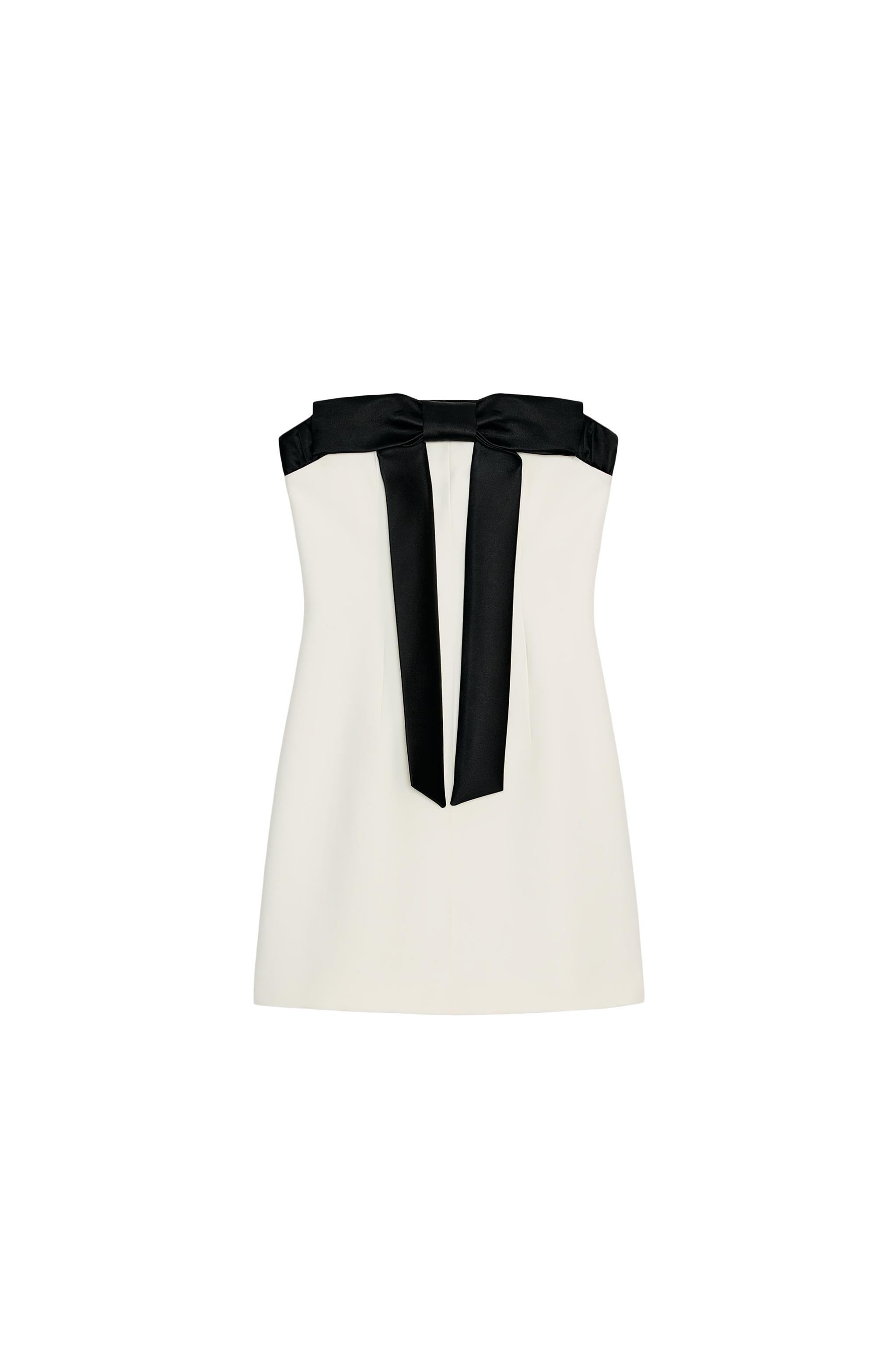 Short dress with a straight neckline and exposed shoulders.