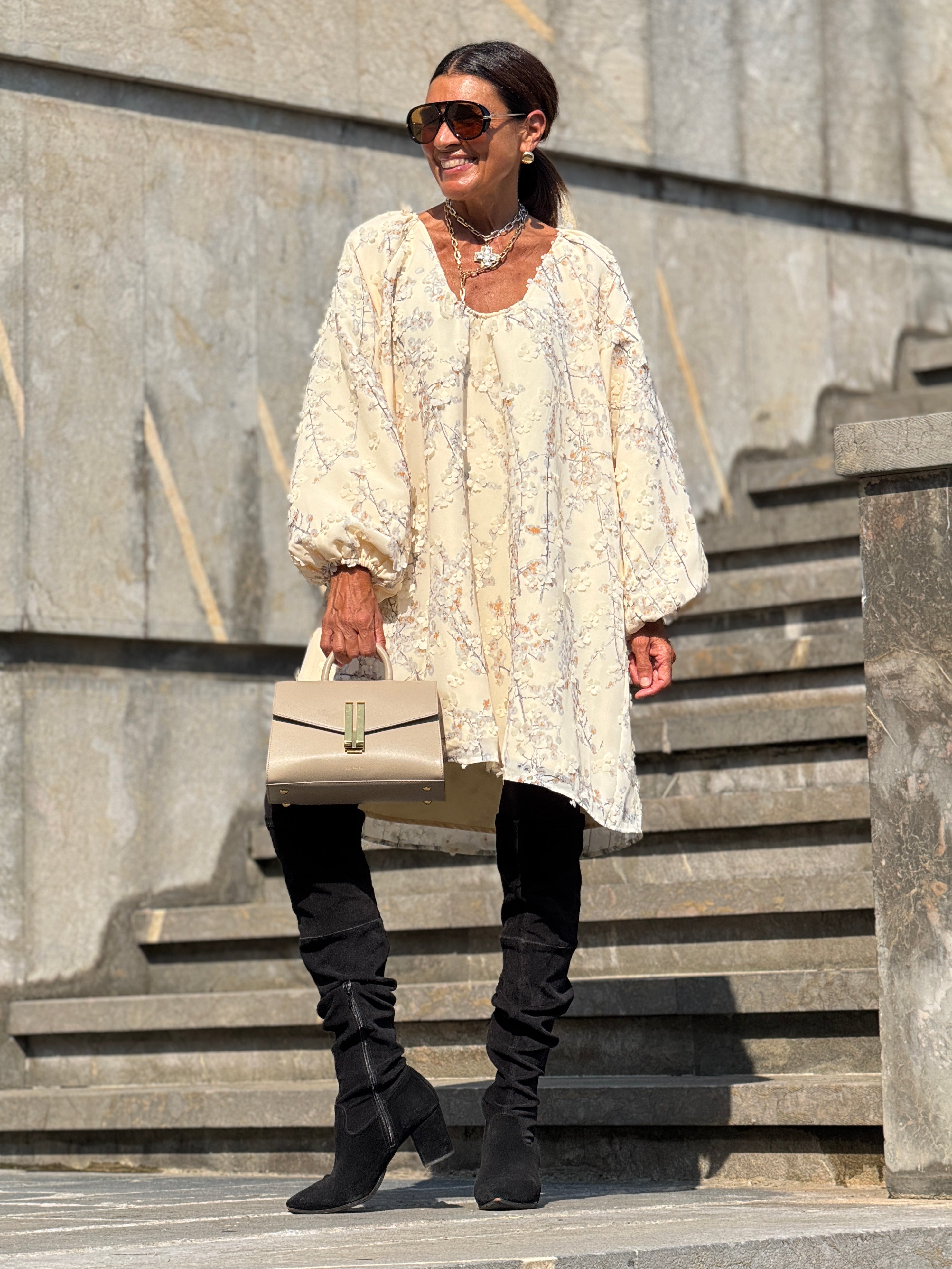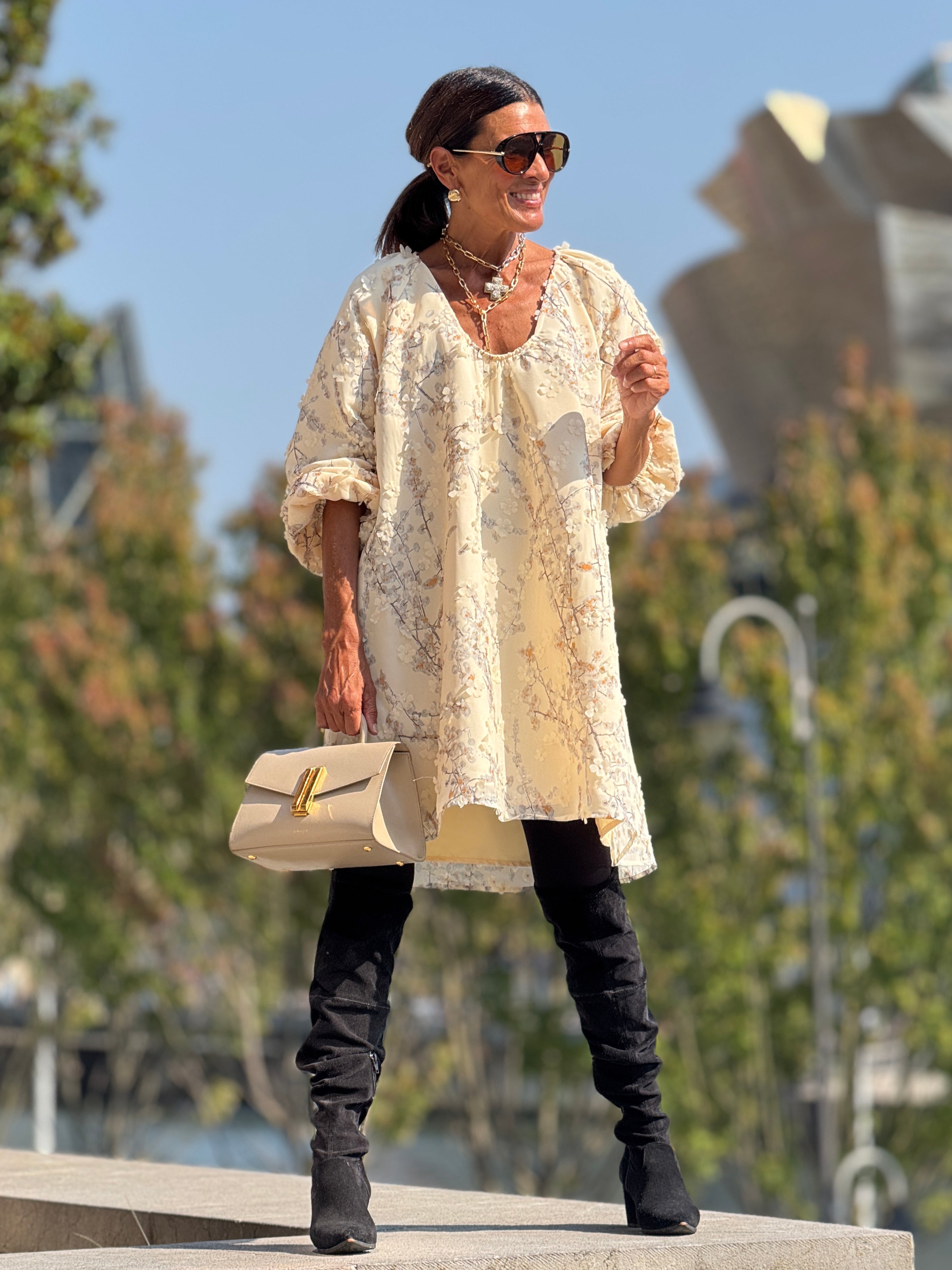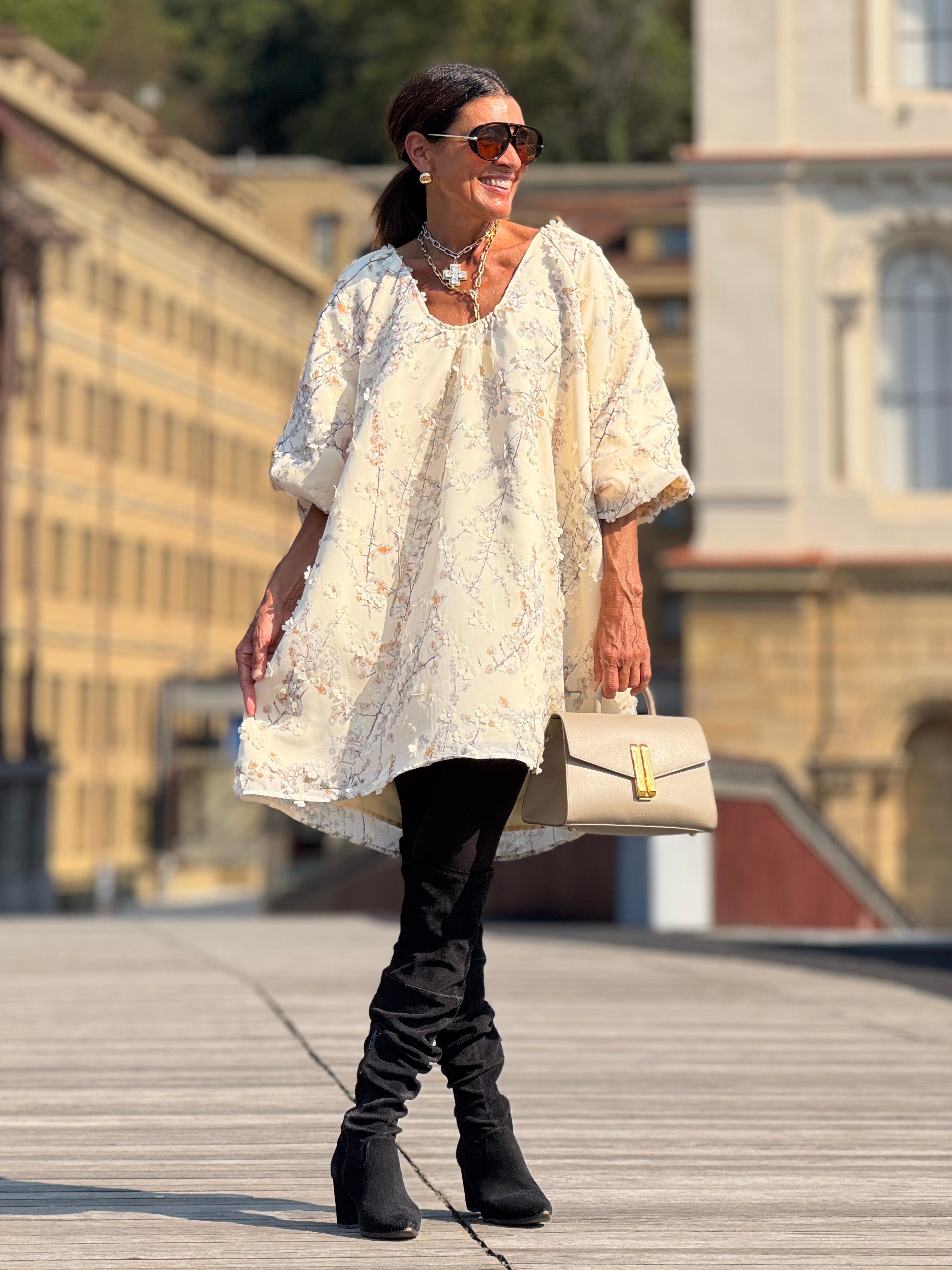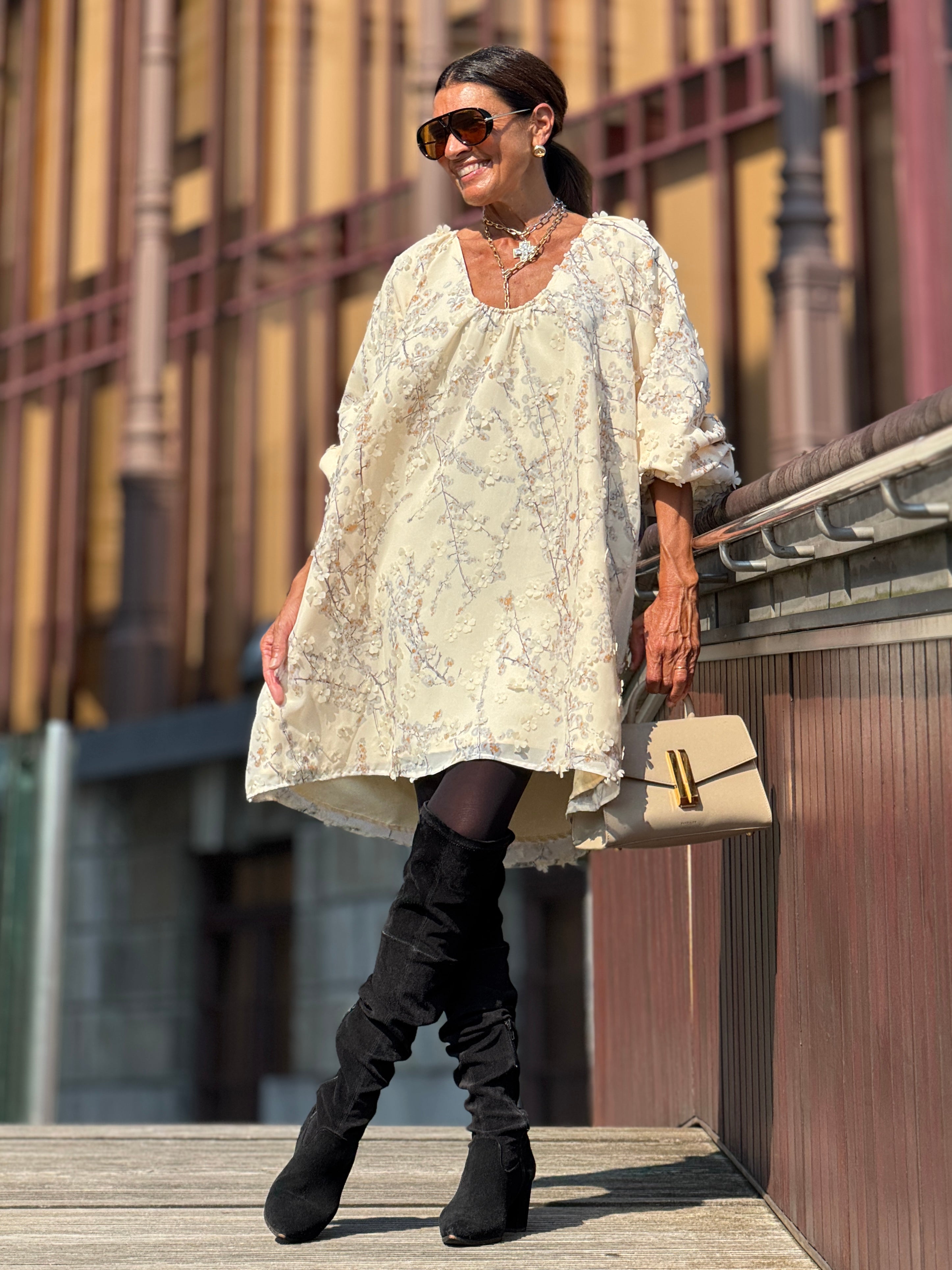 The Dress Candice Embroidery is a stylish and sweet dress made off embroidered fabric with little flowers and sequin details. With a one-size-fits-all design, this dress is suitable for a range of sizes from 34 to 42 in the German size system (see: tab sizes). Measuring a length of 93 cm / 36.6 inches, this dress is perfect for any occasion.