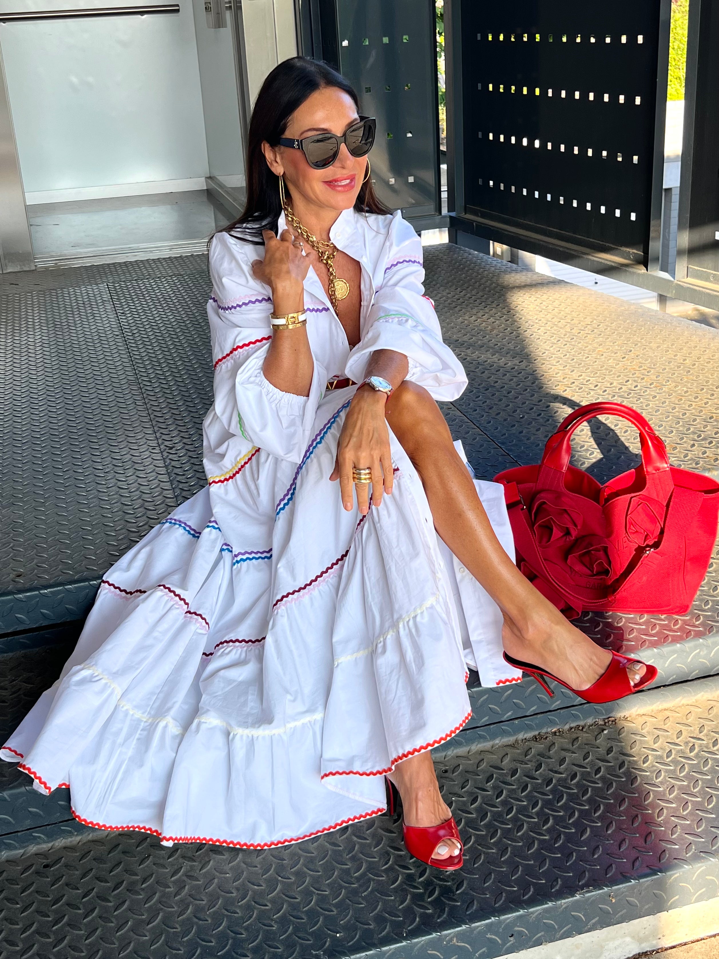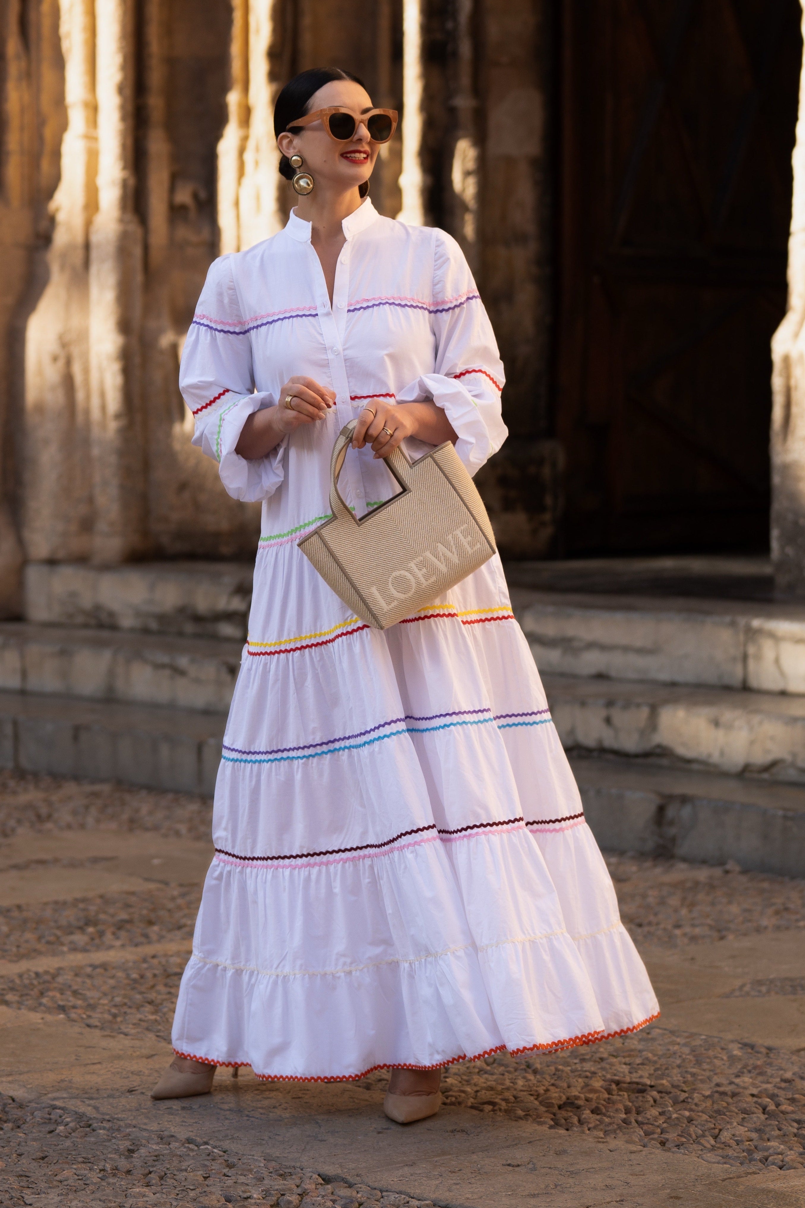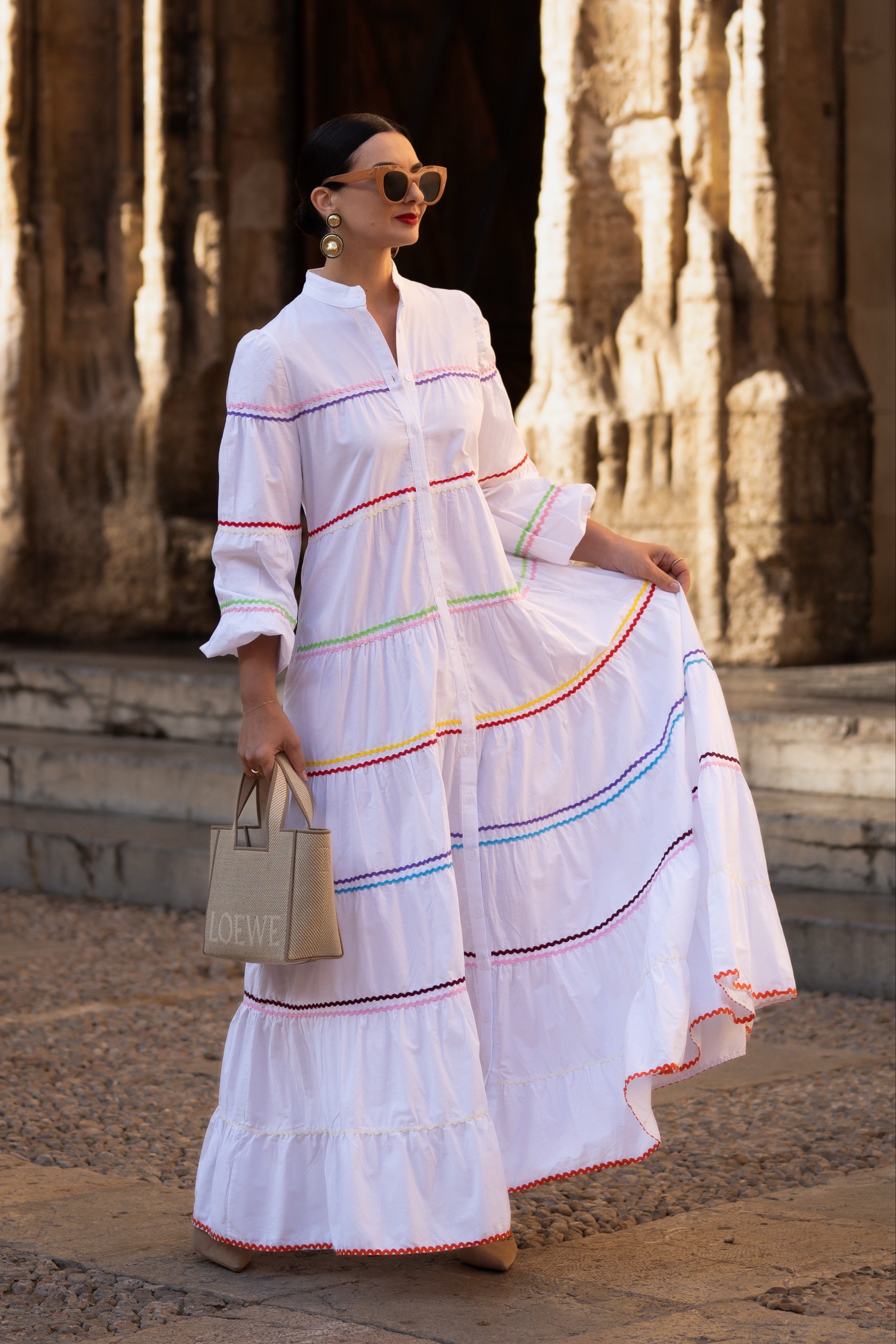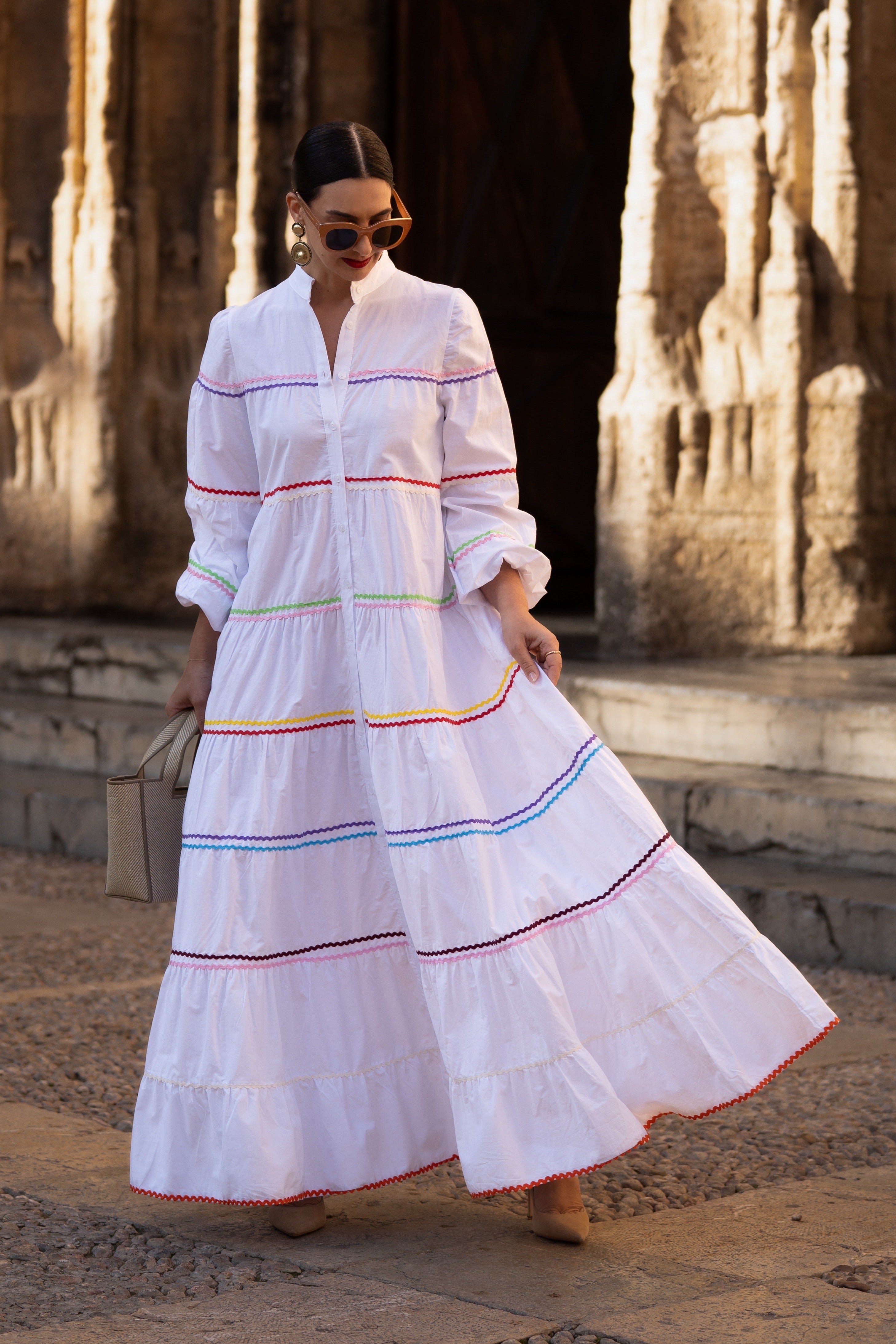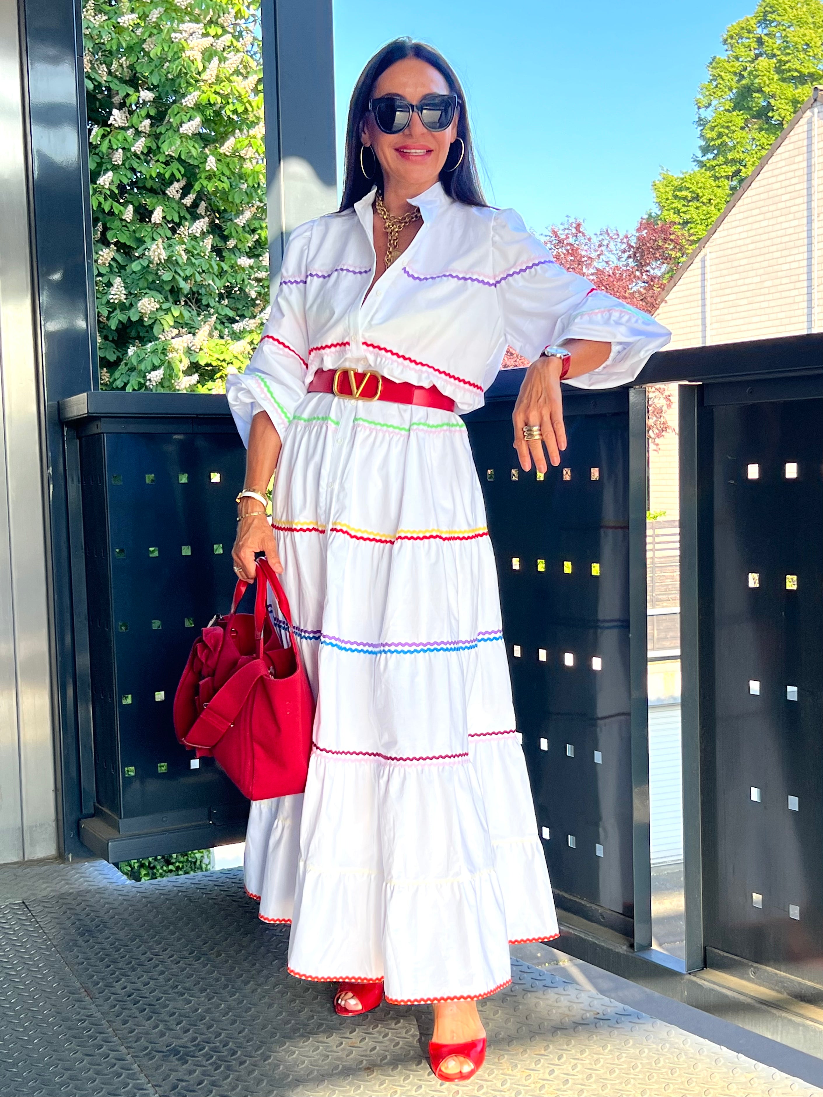 The Clementine White Dress is a stylish and comfortable one size fits all dress from MARIELLE STOKKELAAR. Made from 100% Egyptian cotton with colour accents it is suitable till sizes 42 German, 14 UK, and 10 USA. The length of the dress is 136 cm / 53.5 inch, but it can be shortened if needed.Dress Clementine White has side pockets.