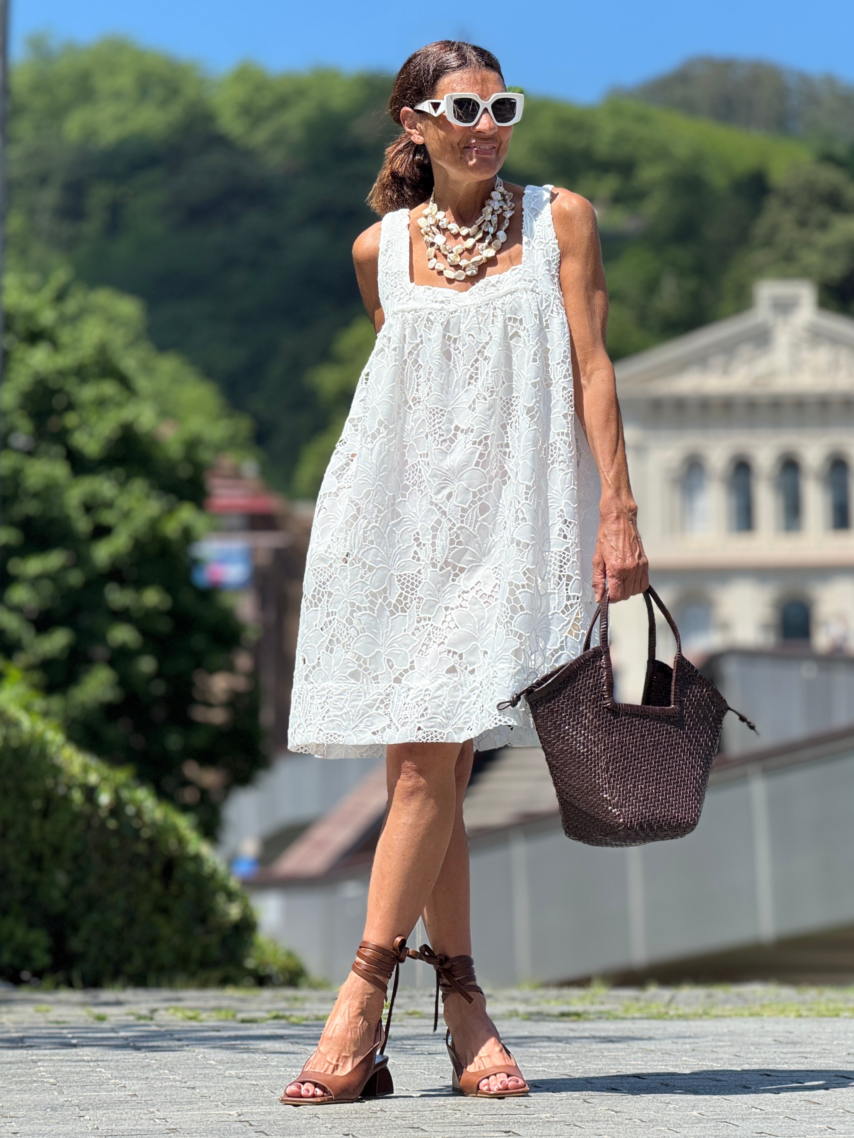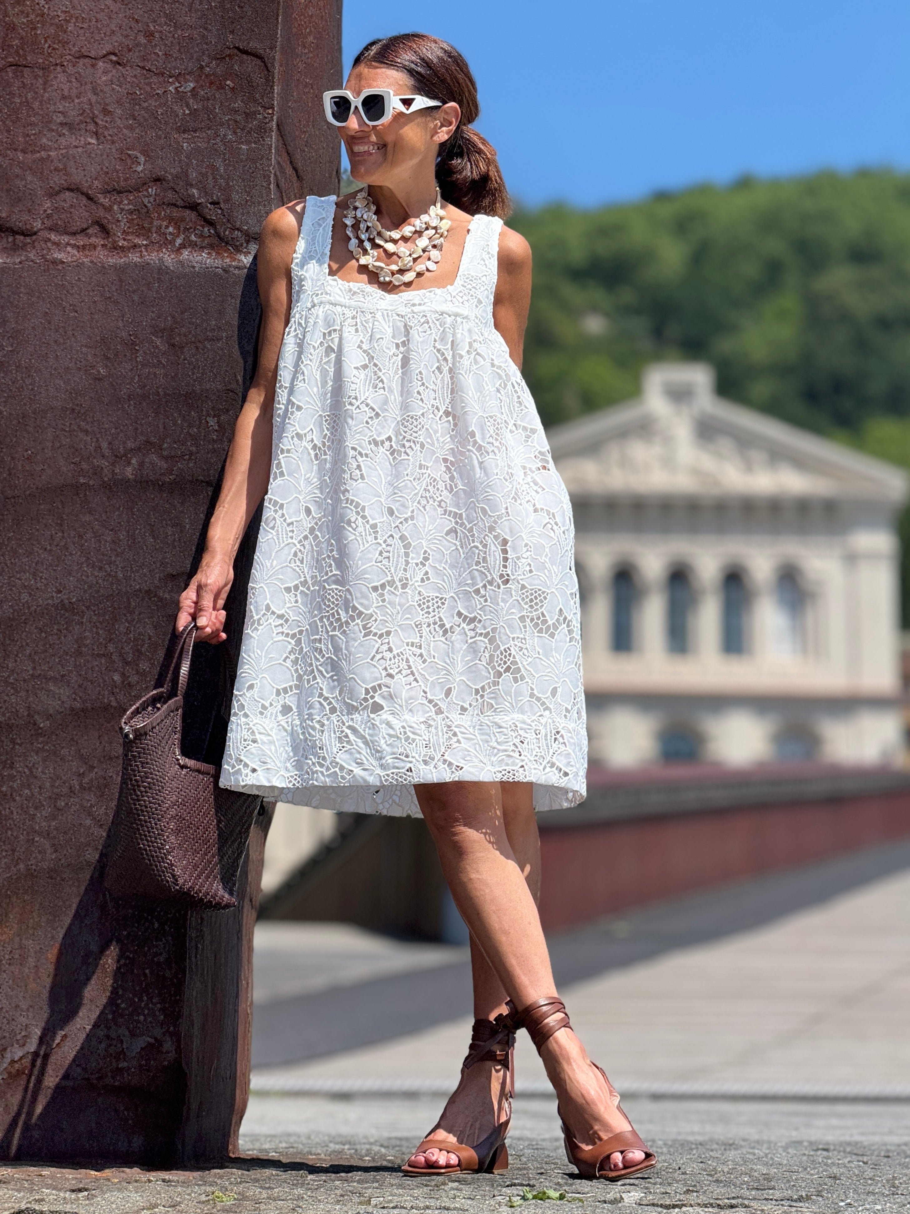The Dress Lucretia Lace White is a stylish and comfortable garment made from delicate Brussels Cotton Lace. With a one size fits all design, this dress is suitable for a range of sizes from 36 to 42 in the German size system (see: tab sizes). This dress is perfect for any occasion. Use machine washes at 30 degrees for easy care and maintenance. Conquer your day in style with Dress Lucretia Lace. The Dress Lucretia Lace comes with a cotton underdress. The length of the dress is 94 cm / 37 inch.