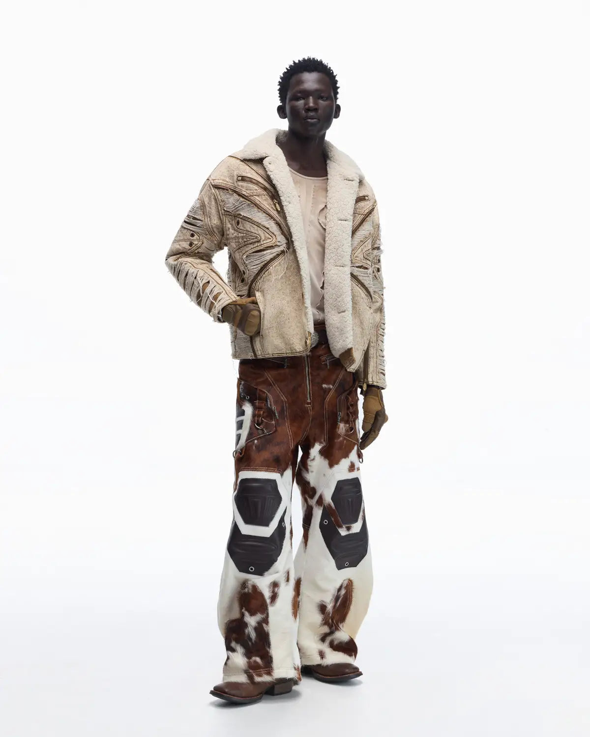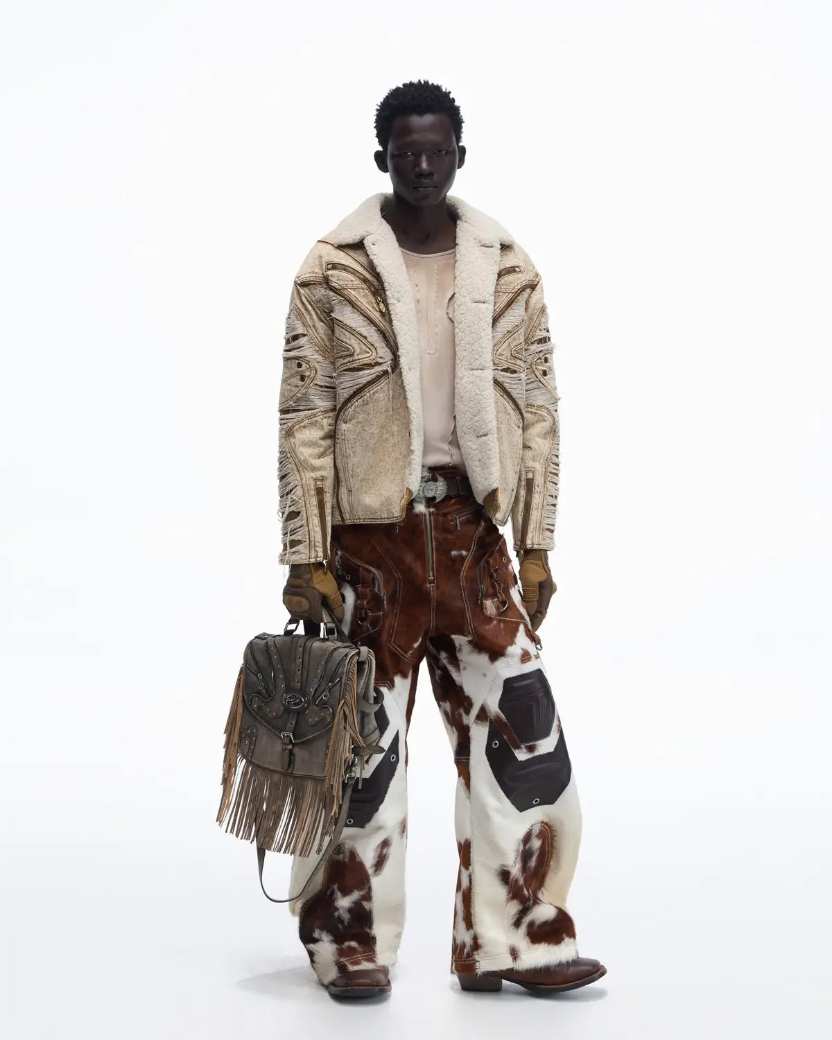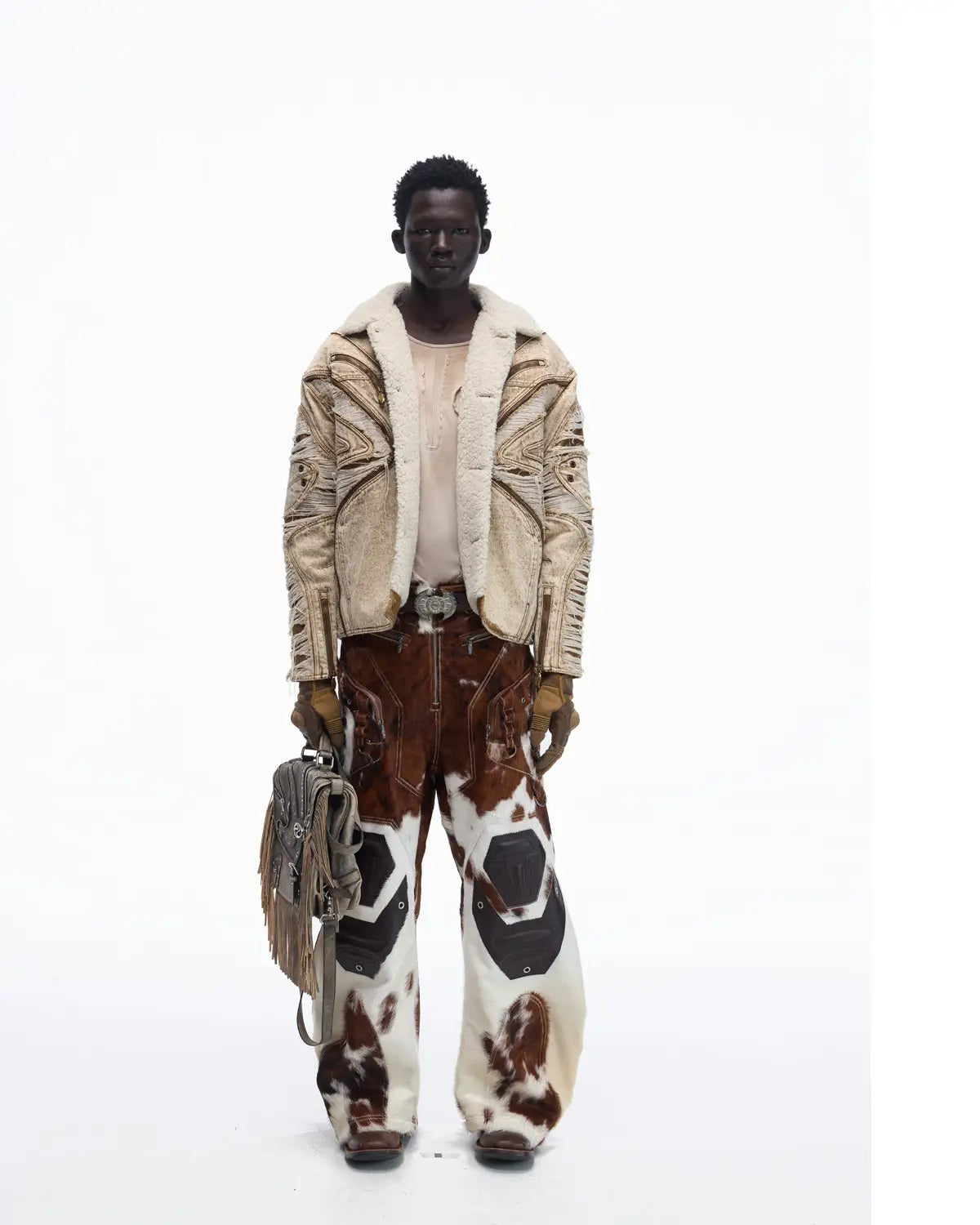 Personsoul Distressed Brown Denim Jacket with Faux-Fur Collar