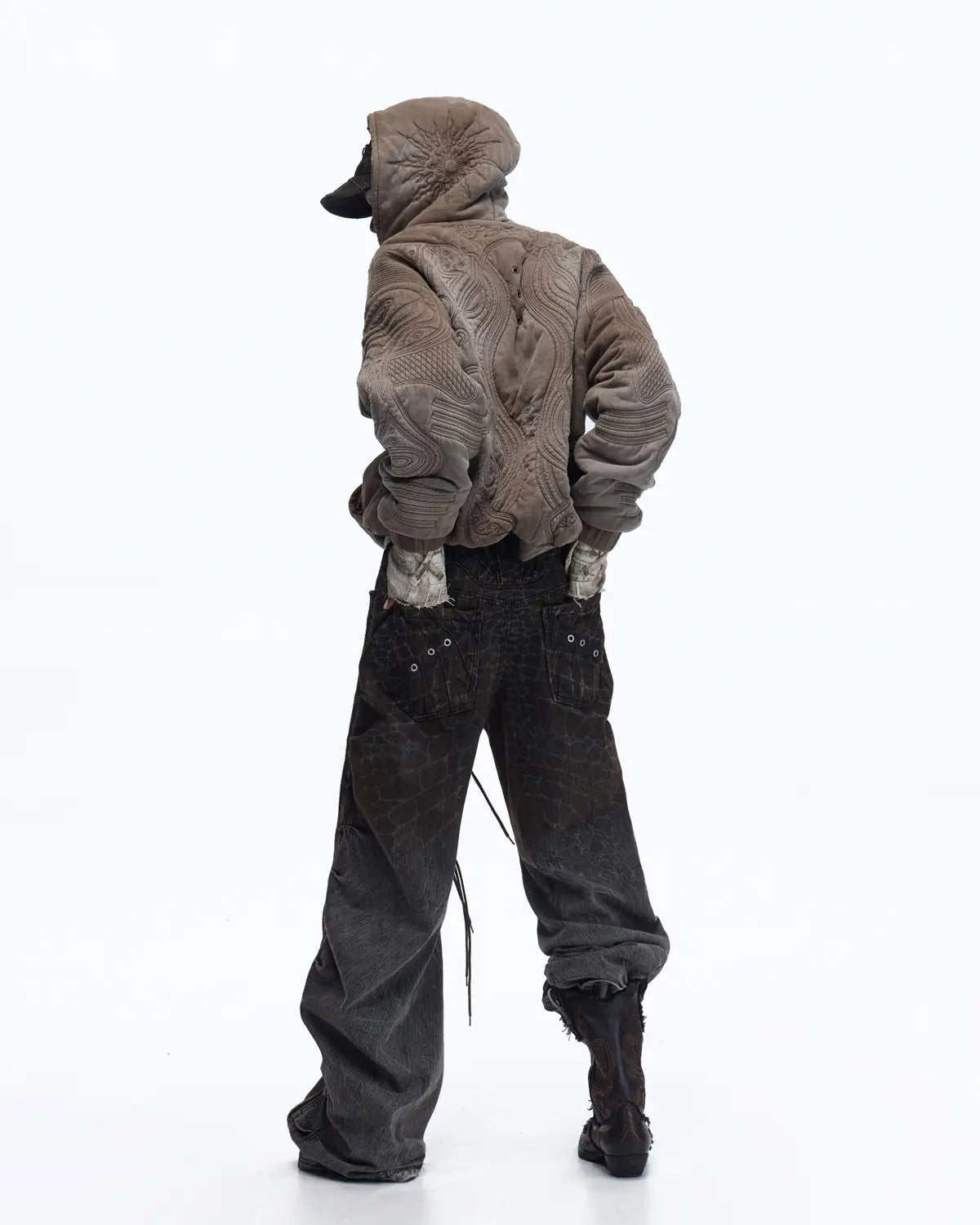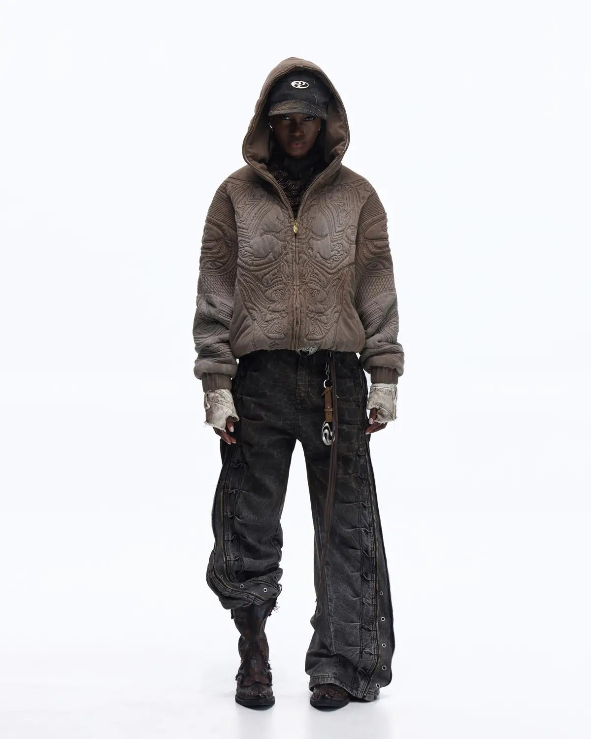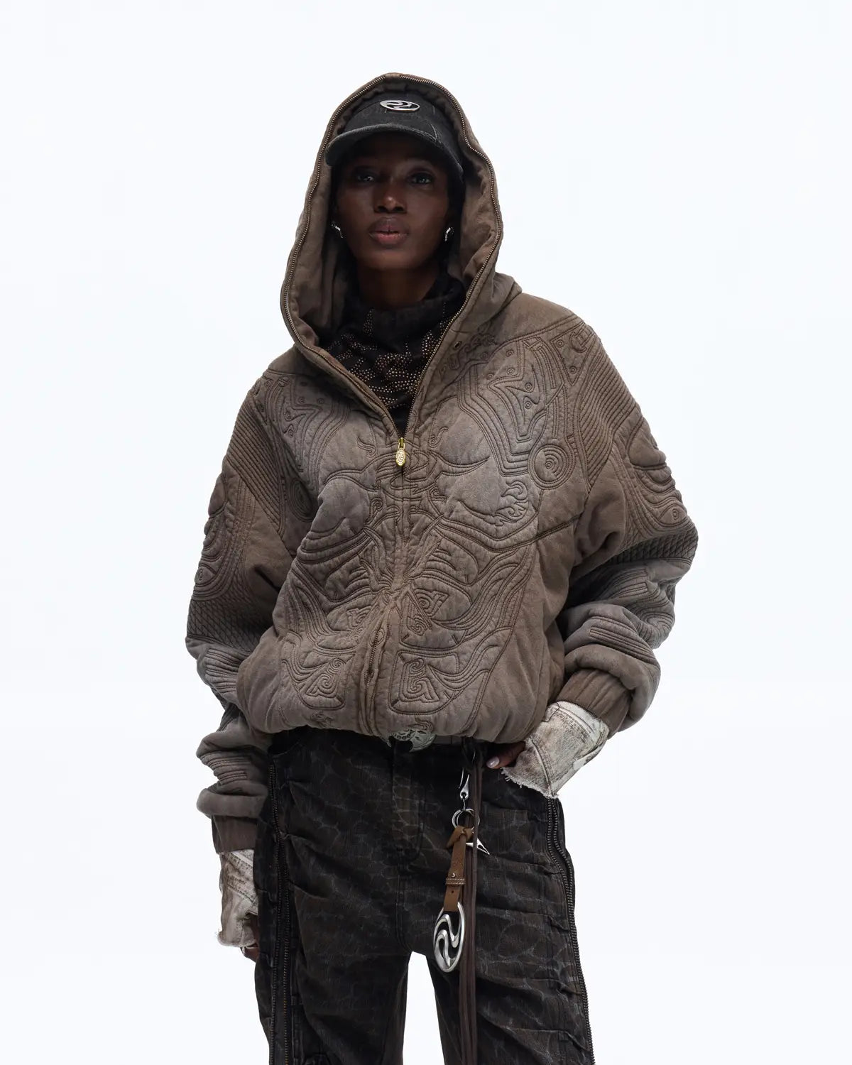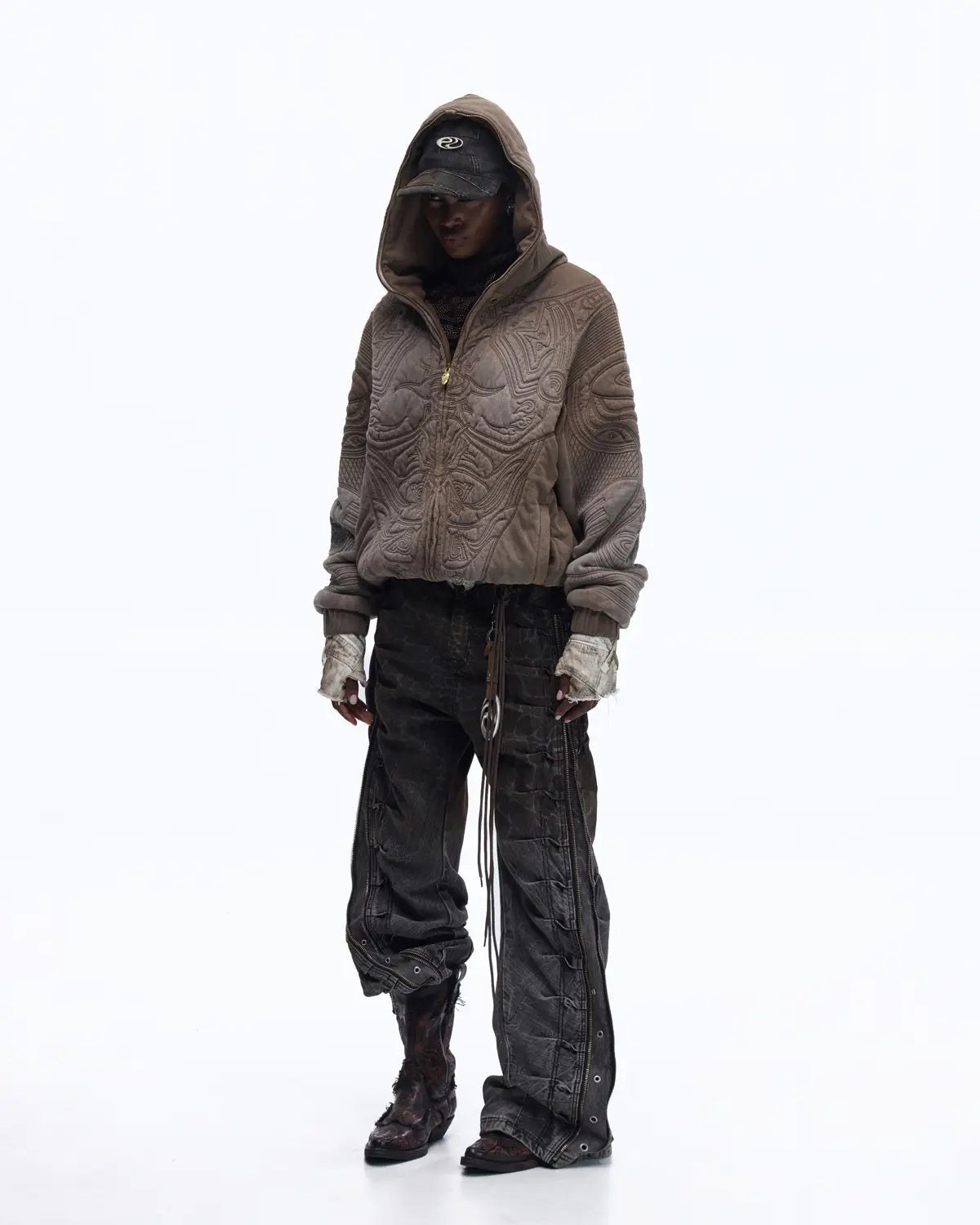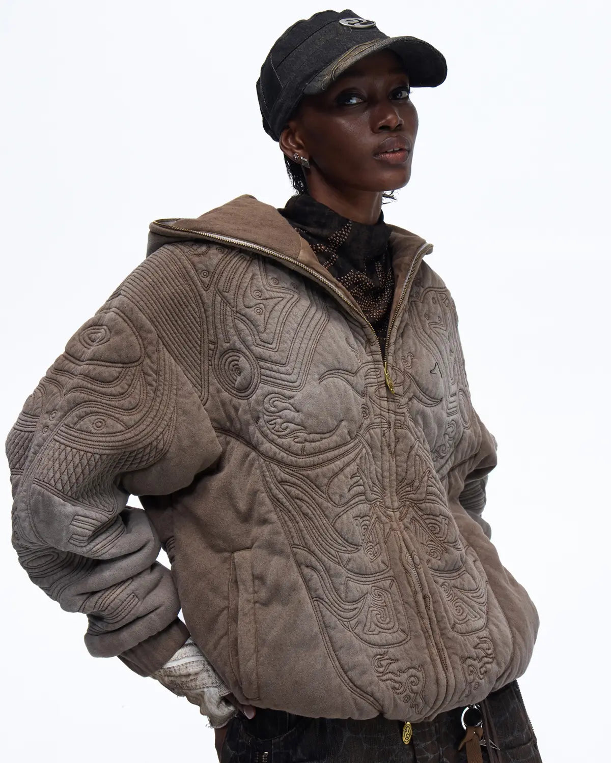 Personsoul Textured Full-Zip Hoodie with Chinese Motif Embroidery In Brown