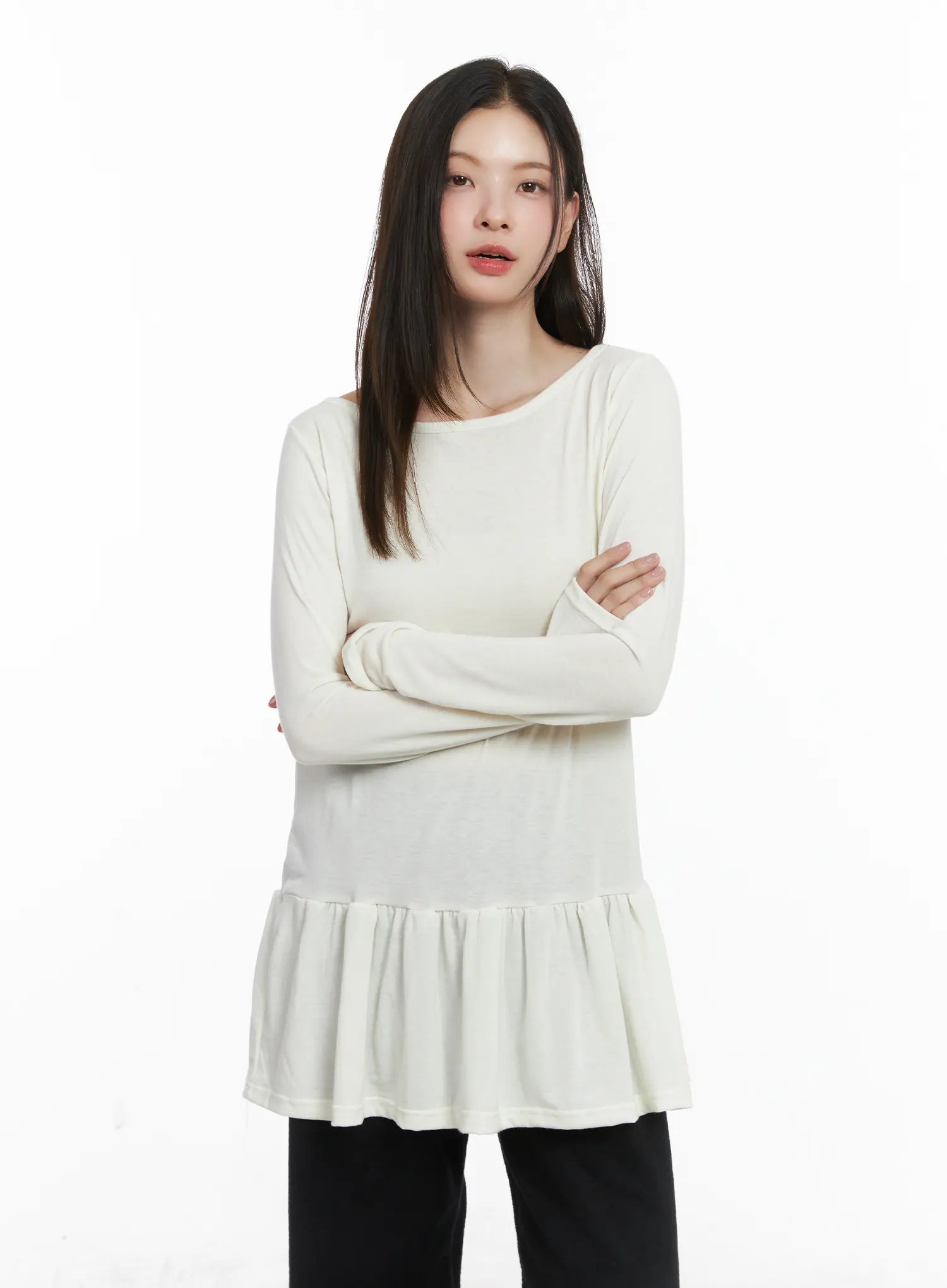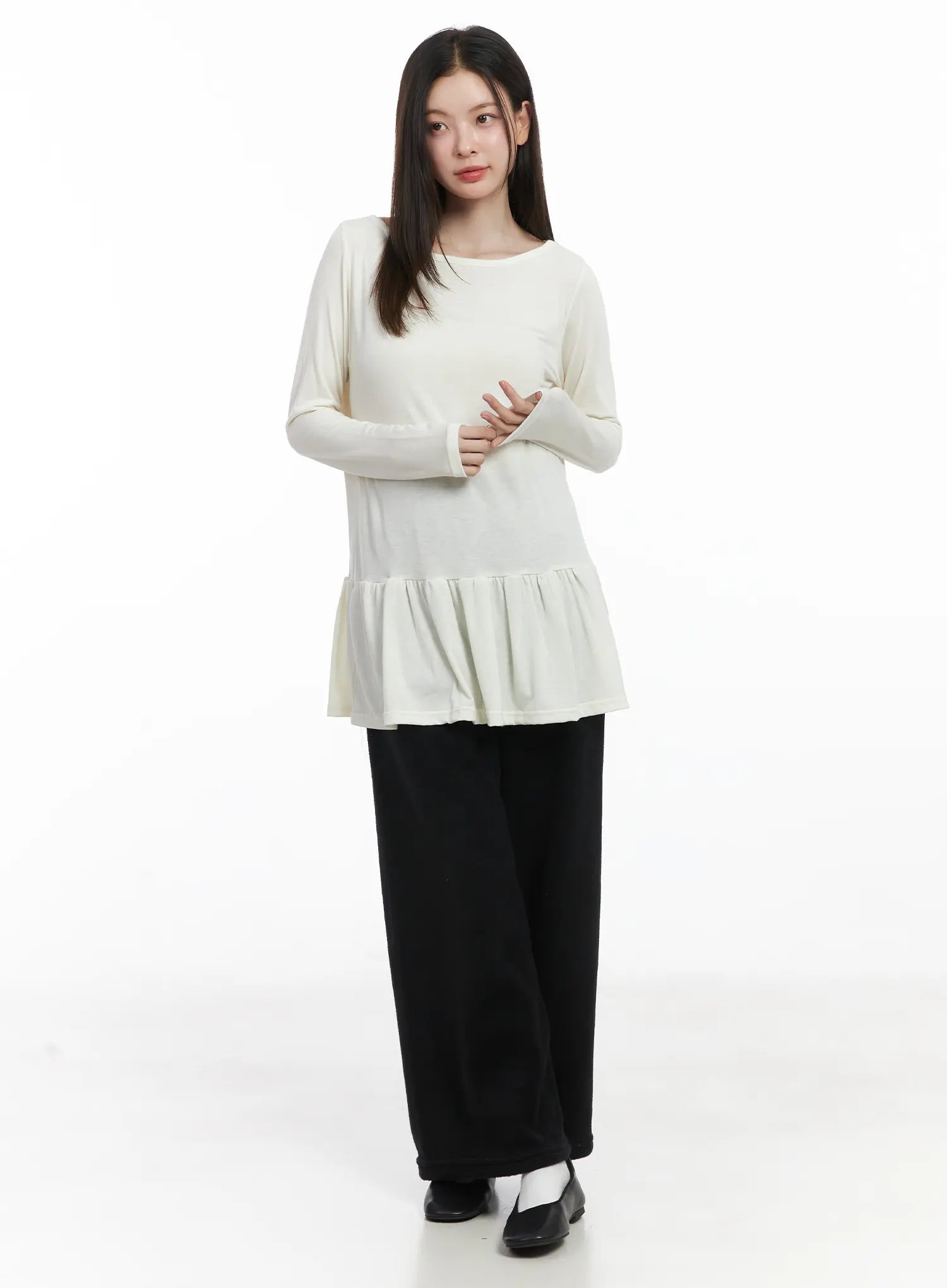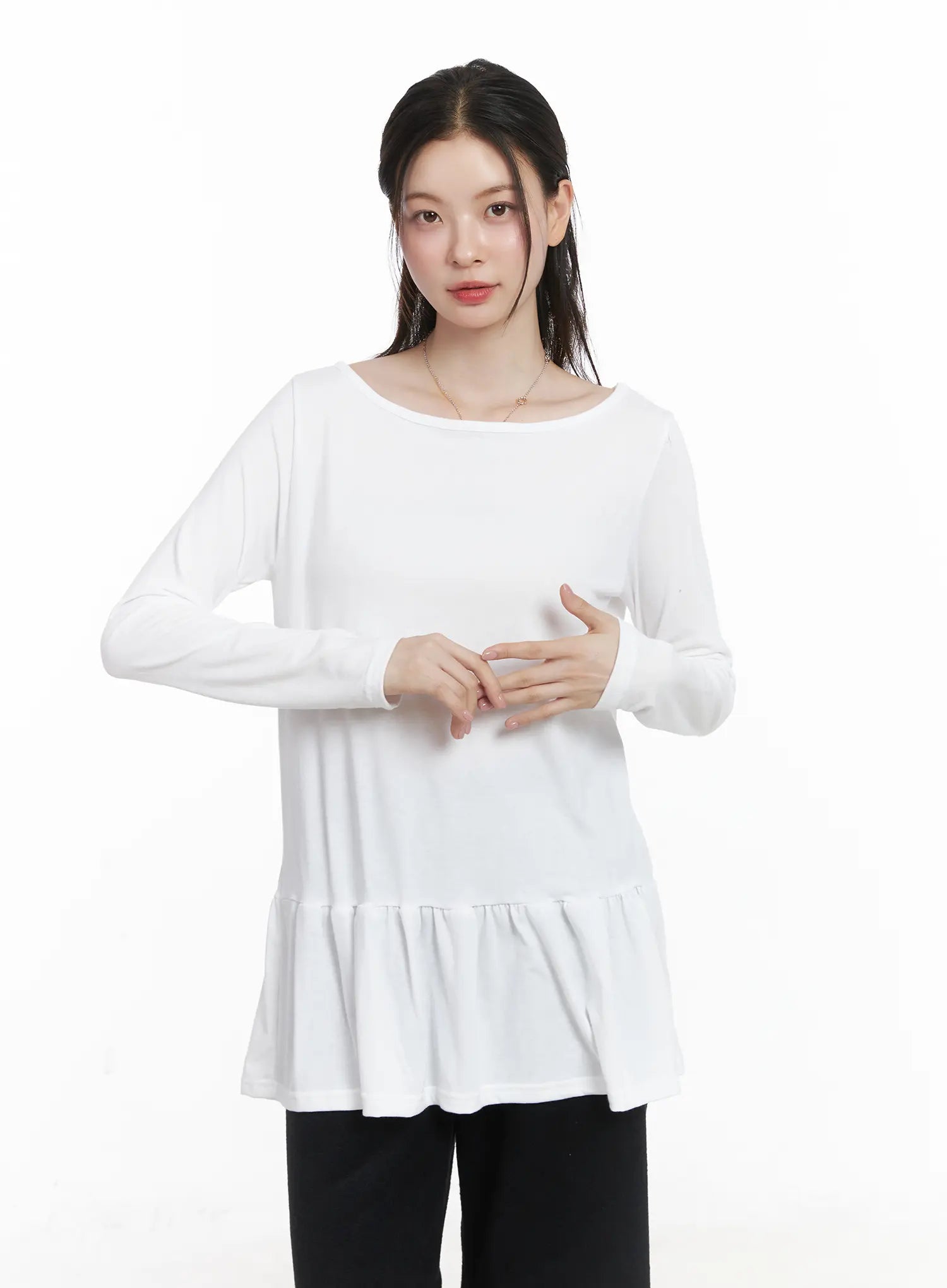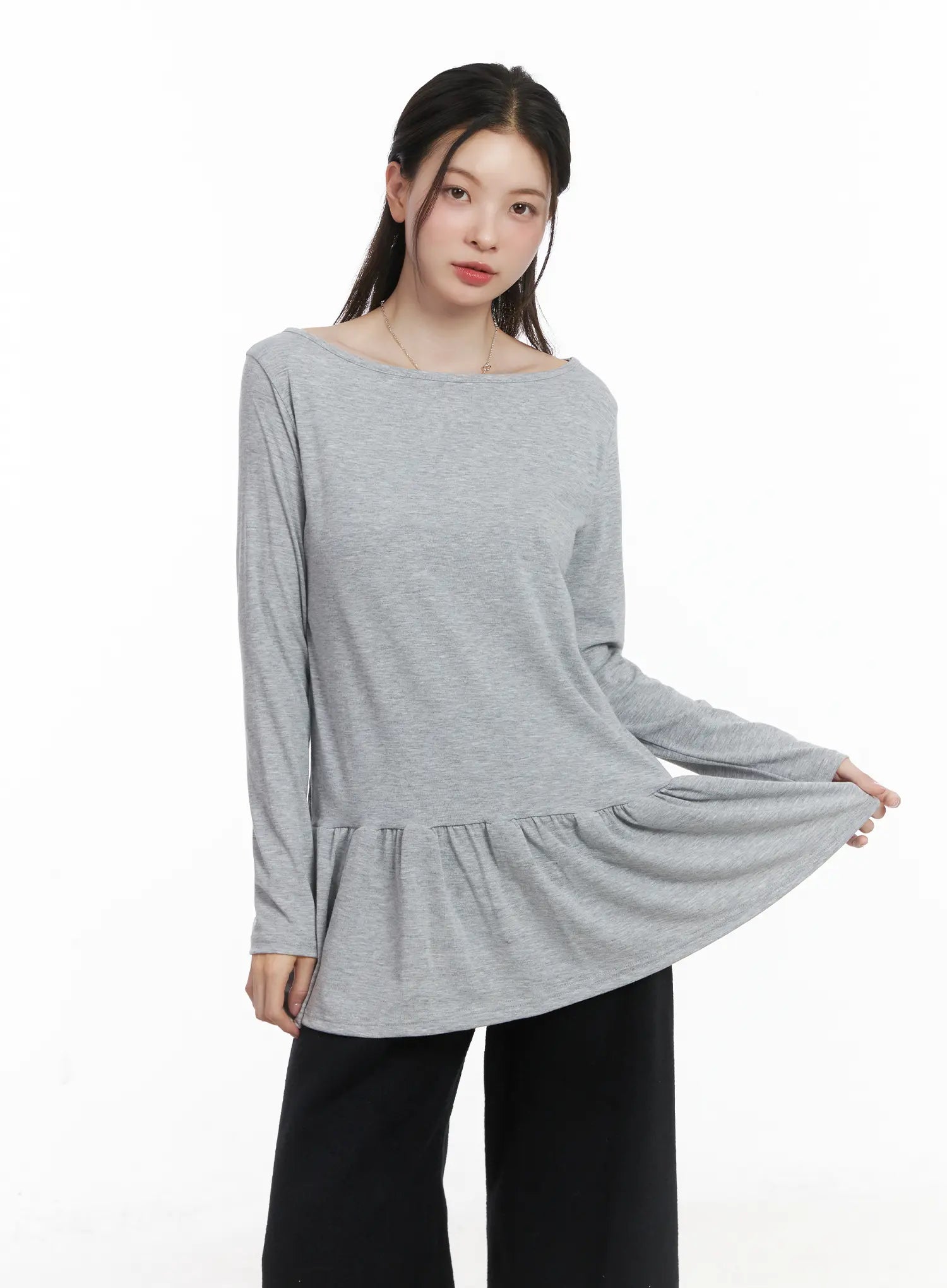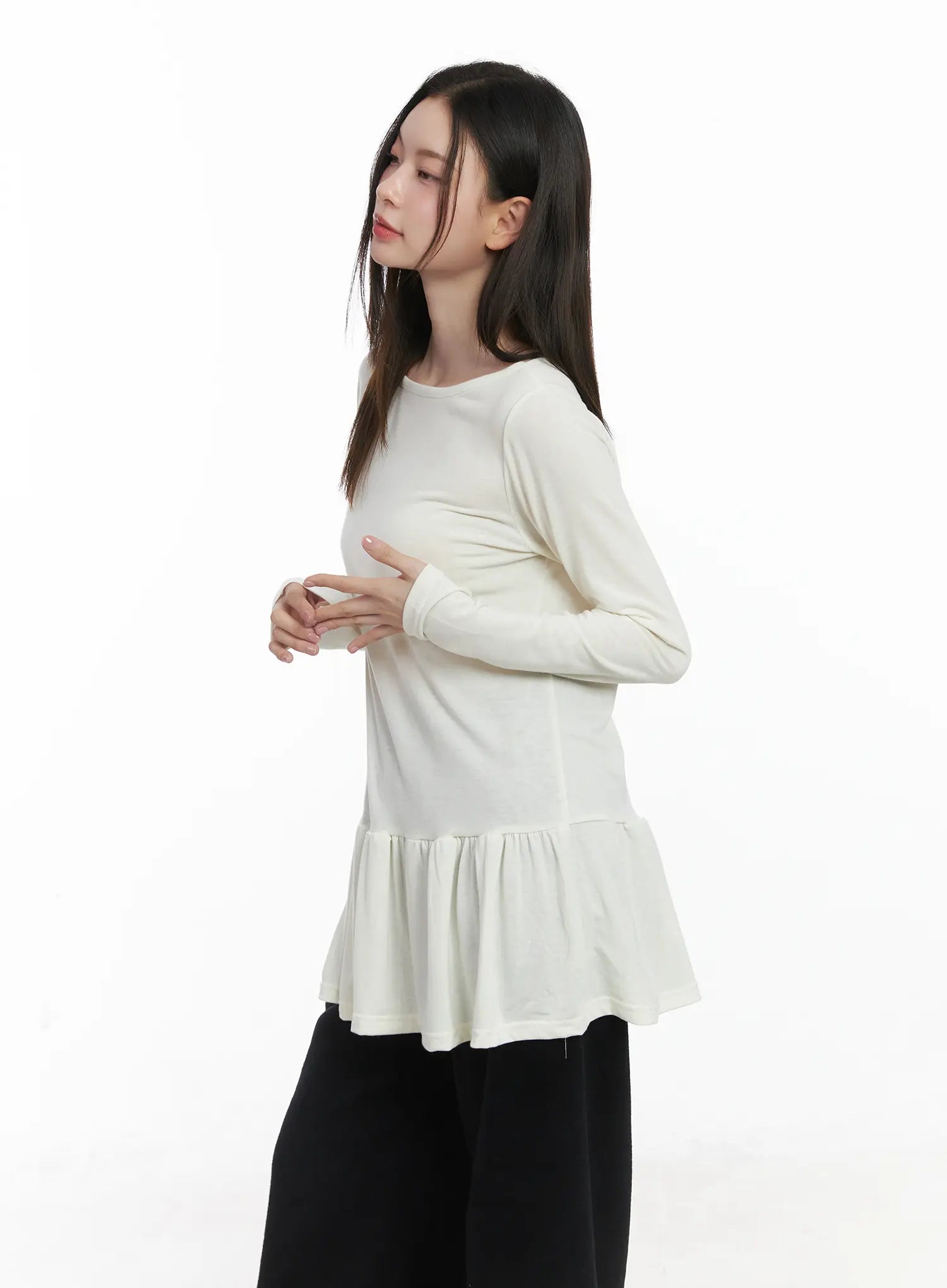 Style : Casual, RomanticOccasion : Back to schoolType : TShirtsDetail : FrillPrint : SolidMaterial : Polyester, Spandex, RayonSleeve : Long sleeveNeck : Round neckFit : Loose fitPolyester 65% , Rayon 30% , Spandex 5%Color : Black, Dark blue, Gray, Brown, Beige, Light blue, White, Dark gray, Dark green, Light beigeModel Size