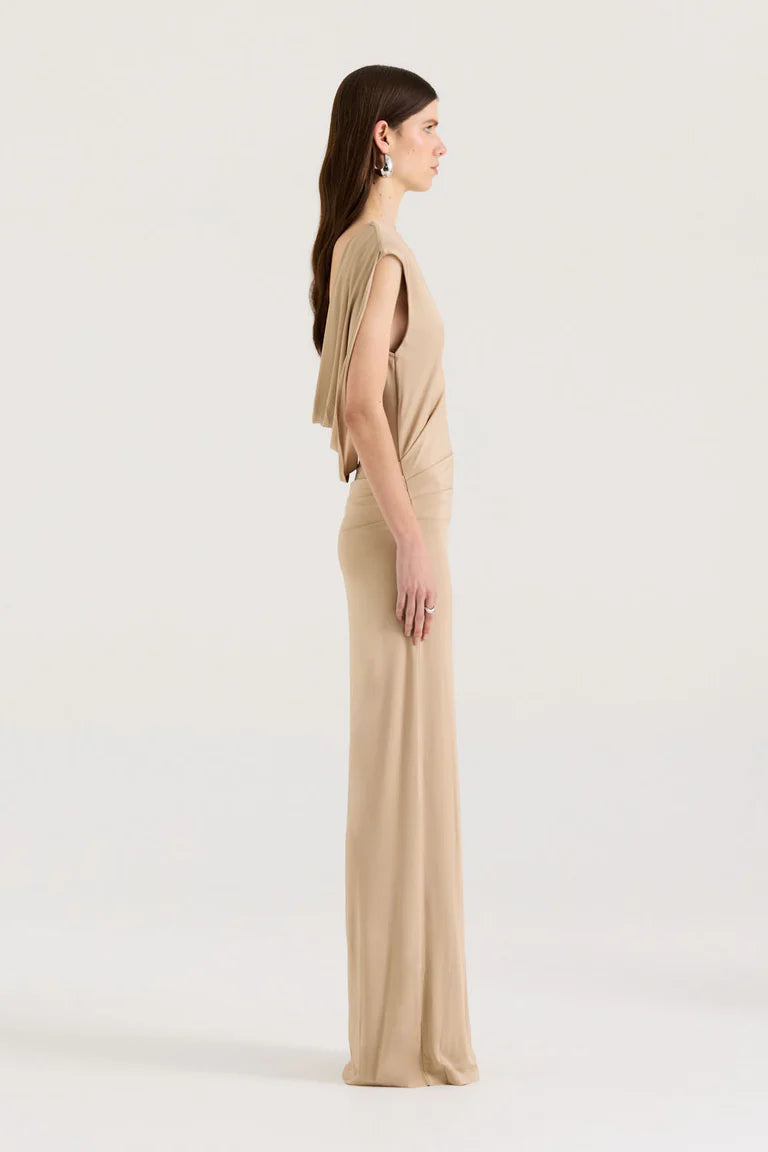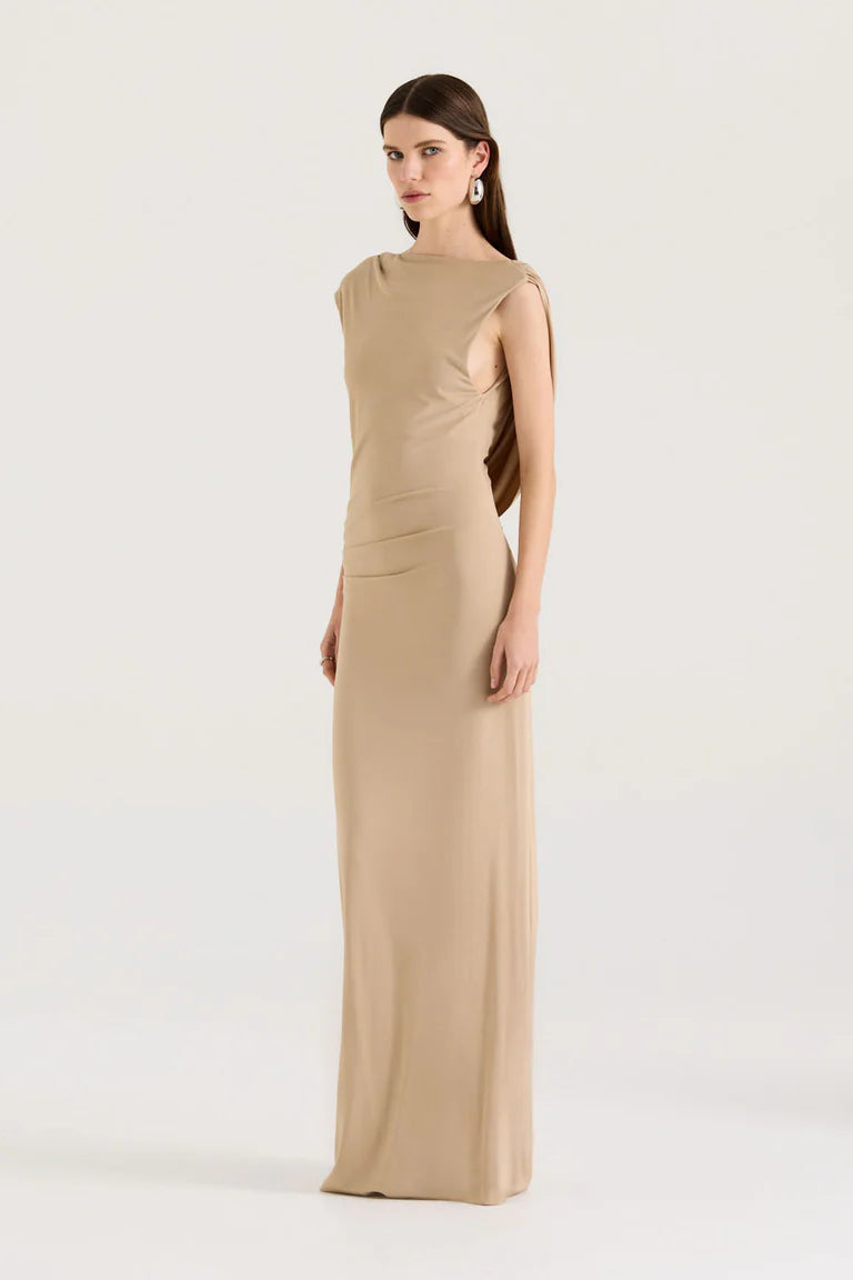 Minimal from the front, unforgettable from the back. This light khaki gown features a refined boat neckline and a clean sleeveless silhouette, contrasted by dramatic ruched detailing across the open back. Elegant, sculpting, and effortlessly sensual—made for formal nights and elevated occasions.