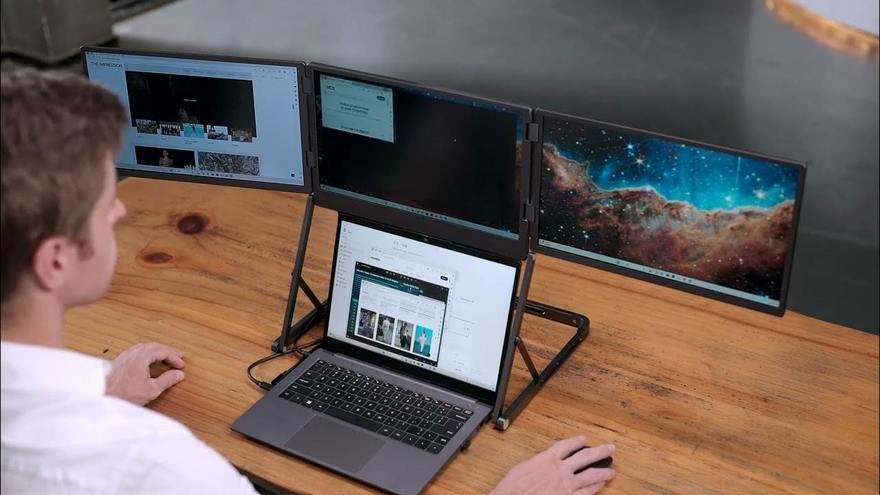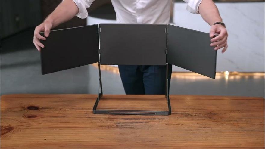 More Crazy Multiscreen This product consists of three 15.6-inch 4K screens, a built-in battery, and a built-in stand. It folds up to the size of a briefcase for easy transport and weighs 3 kg (6.6 lbs). It's compatible with Macs and PCs.