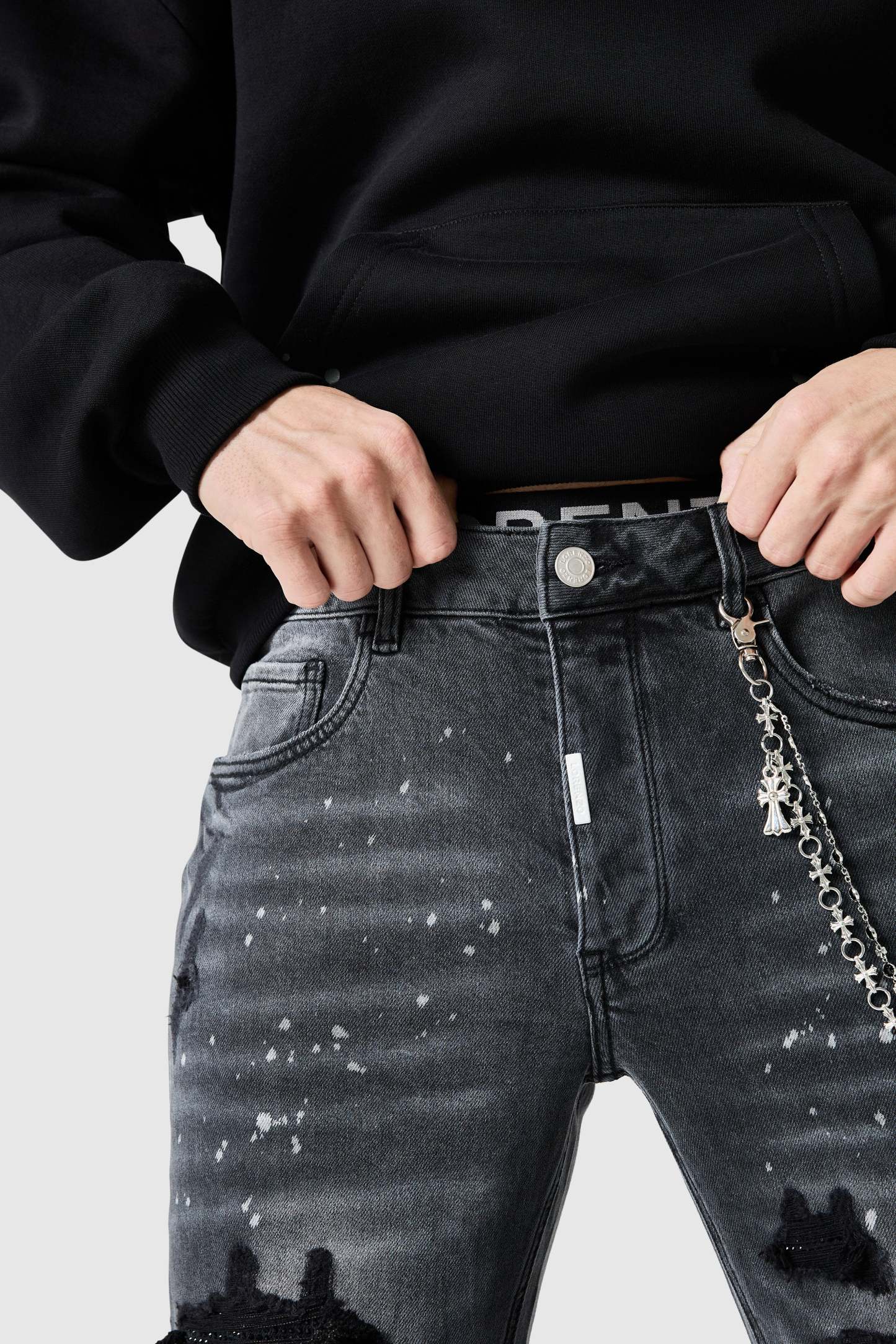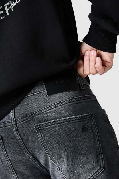 The Dillon Diamante Jean offers a slim fit with a slightly looser waist and thigh, delivering a close, comfortable silhouette with diamante detail. Finished with backed distressing and subtle paint splash detailing for a modern edge.