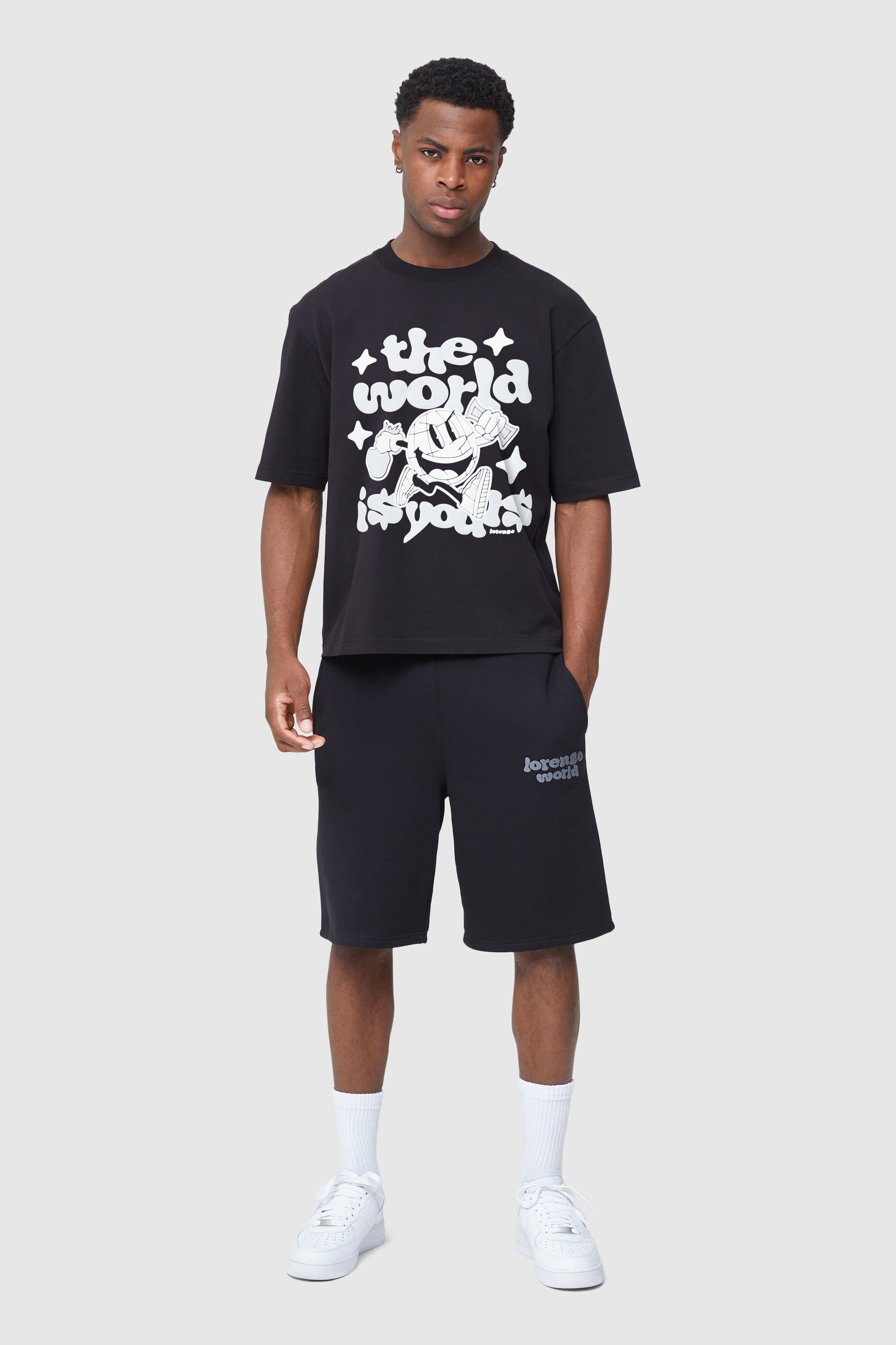 The World Is Yours Twinset. This product pairs the statement puff print tee with matching heavyweight shorts, designed for everyday wear with a premium feel. Finished in a clean Black and White combo for effortless styling.